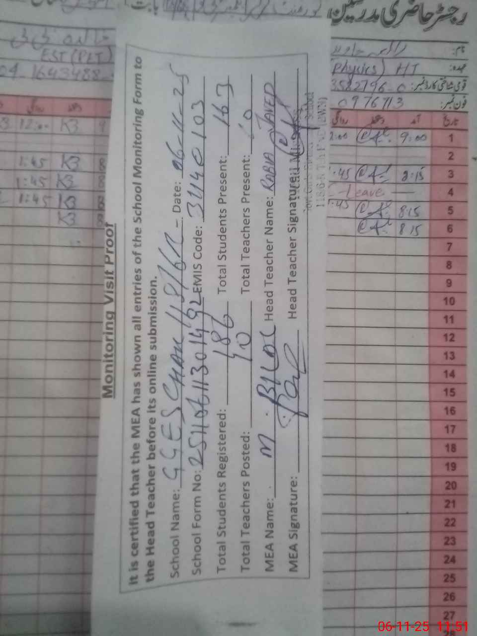 | Attendance Register | Head Teacher | MEA with School | Visit Proof |
