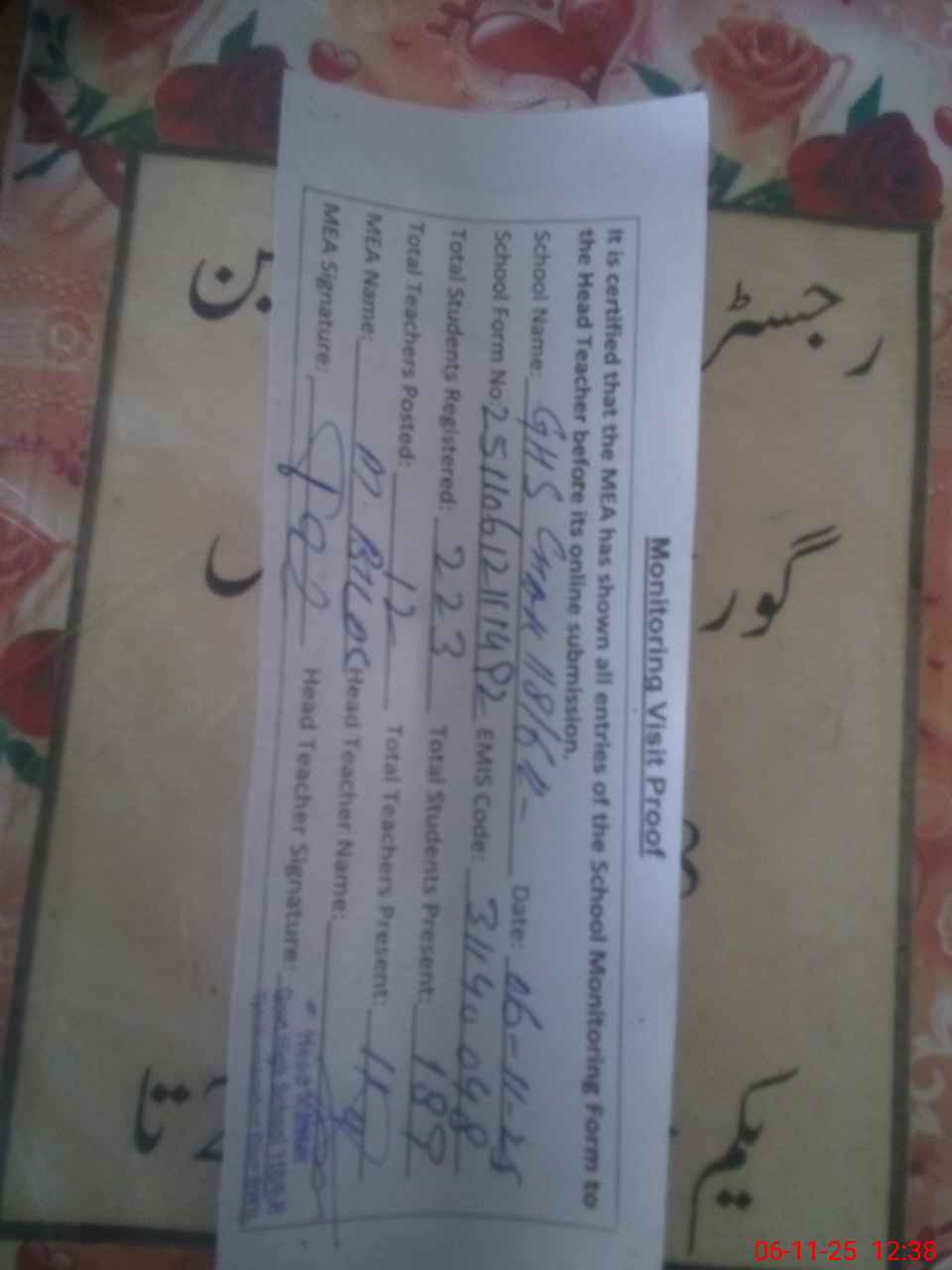 | Attendance Register | Head Teacher | MEA with School | Visit Proof |