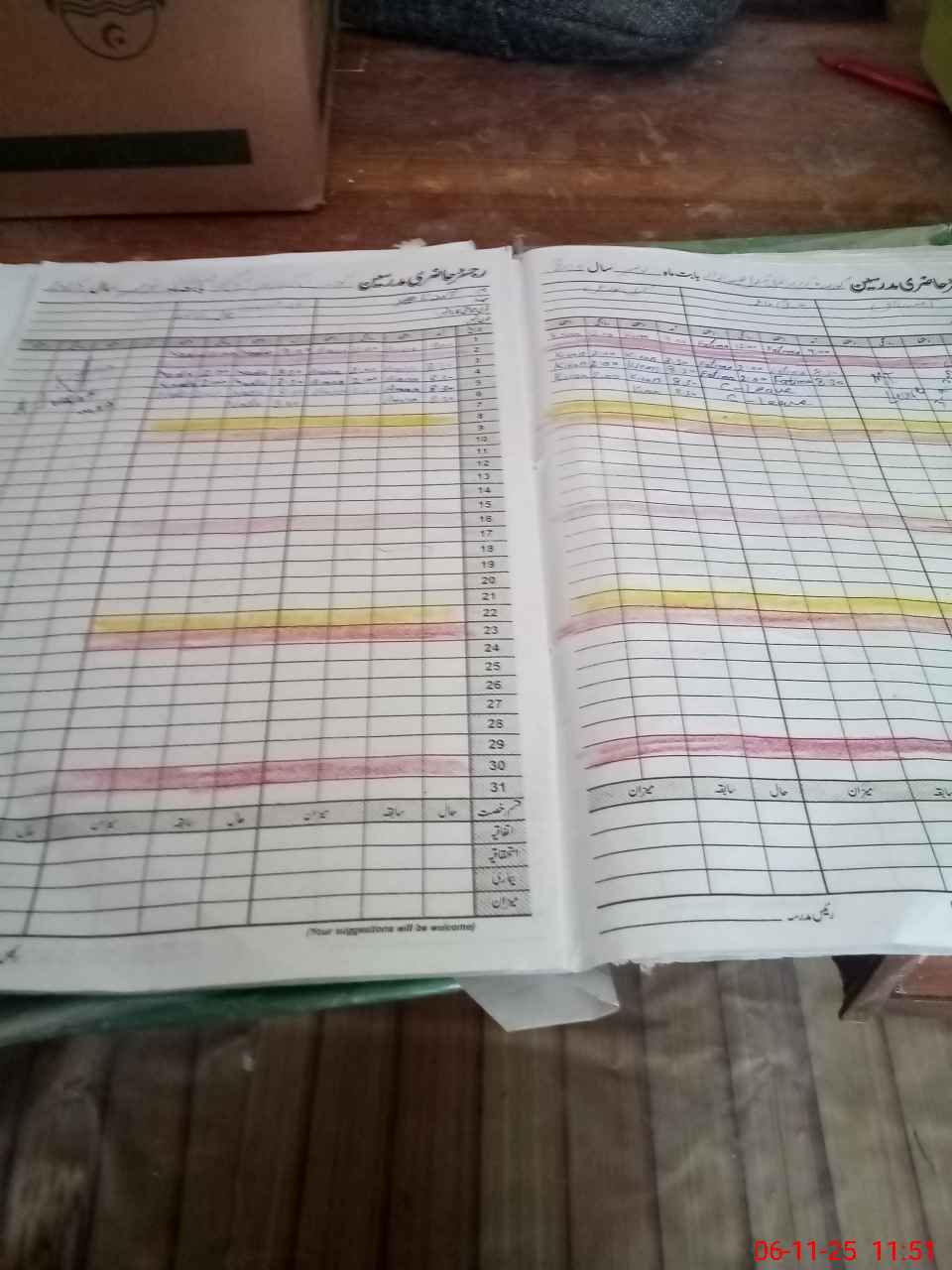 | Total no. of Classrooms: 3 No. of Classrooms Used for Teaching: 3 No. of Classrooms Storing Old Furniture, FTBs, etc: 0Comments if Any: Head teacher Aamna Razzak absent no M t leave approved record in school No nsb record no ftf record no D3 form available naib Qasid Nadir physical absent |