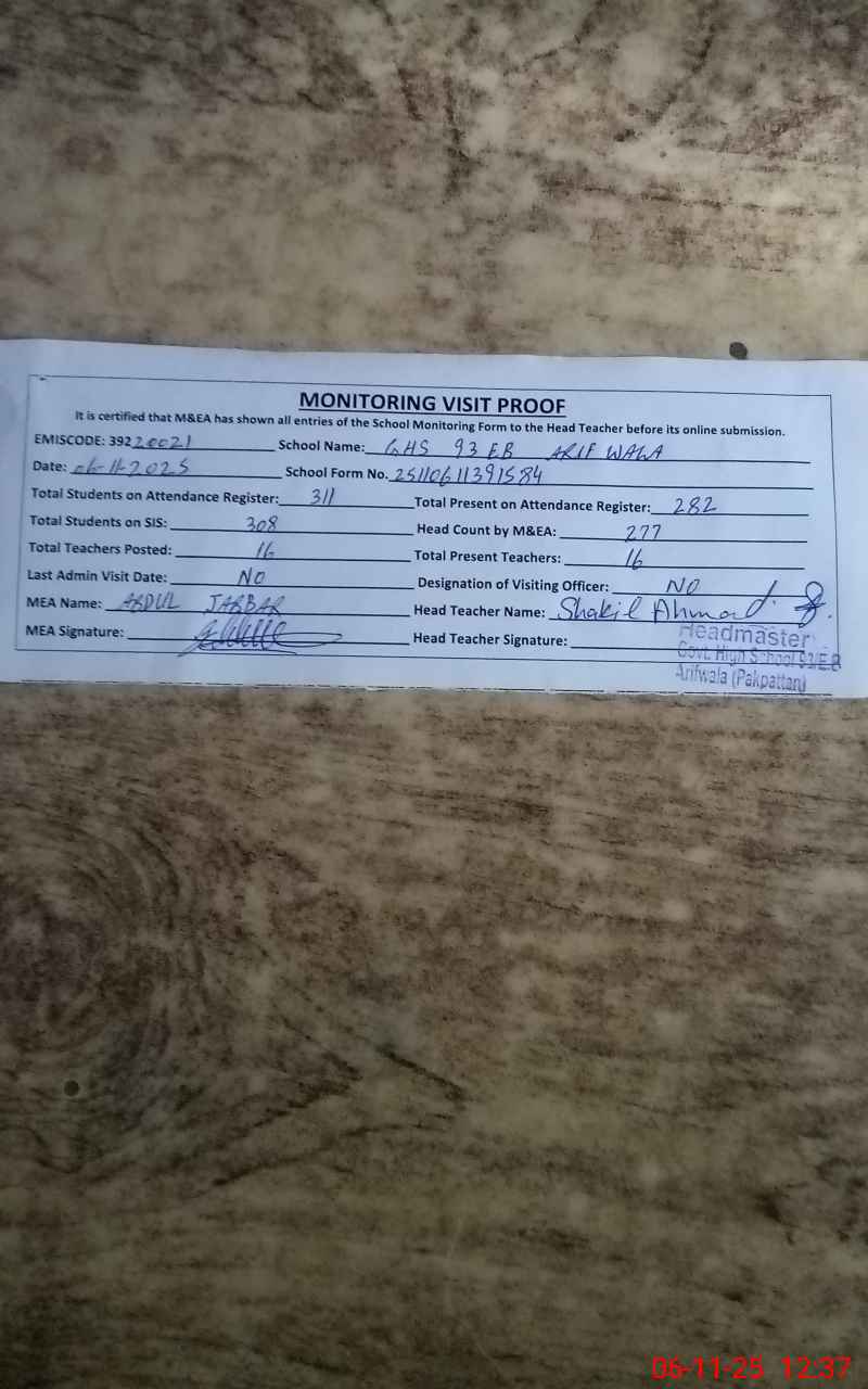 | EMIS Code: 39220021 | Name of School: GHS 93/E-B TEH ARIF WALA | |||