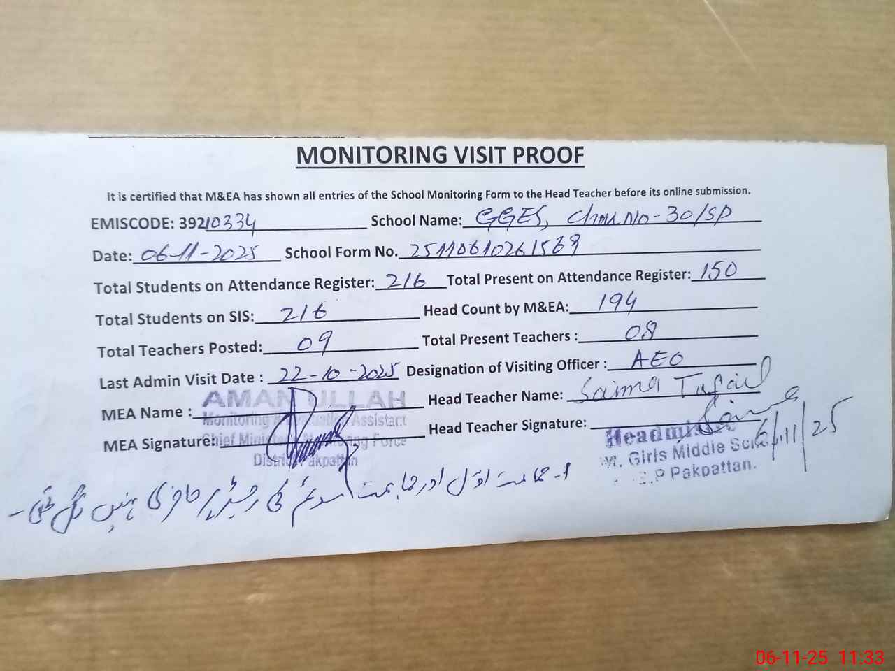 | Attendance Register | Head Teacher | MEA with School | Visit Proof |