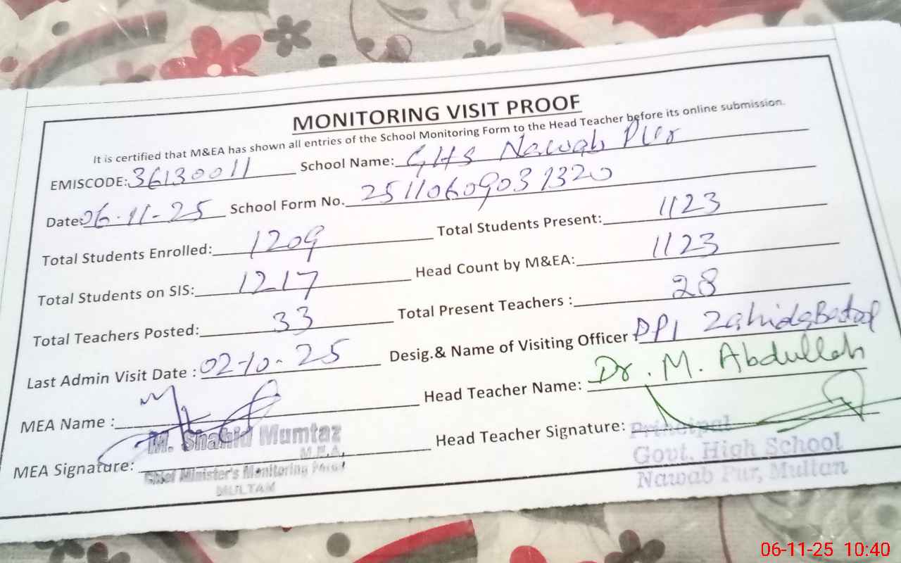 | EMIS Code: 36130011 | Name of School: GHS NAWAB PUR MULTAN | |||