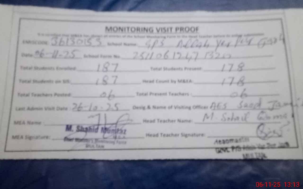 | EMIS Code: 36130153 | Name of School: GPS ALLAH YAR PUR JARH | |||