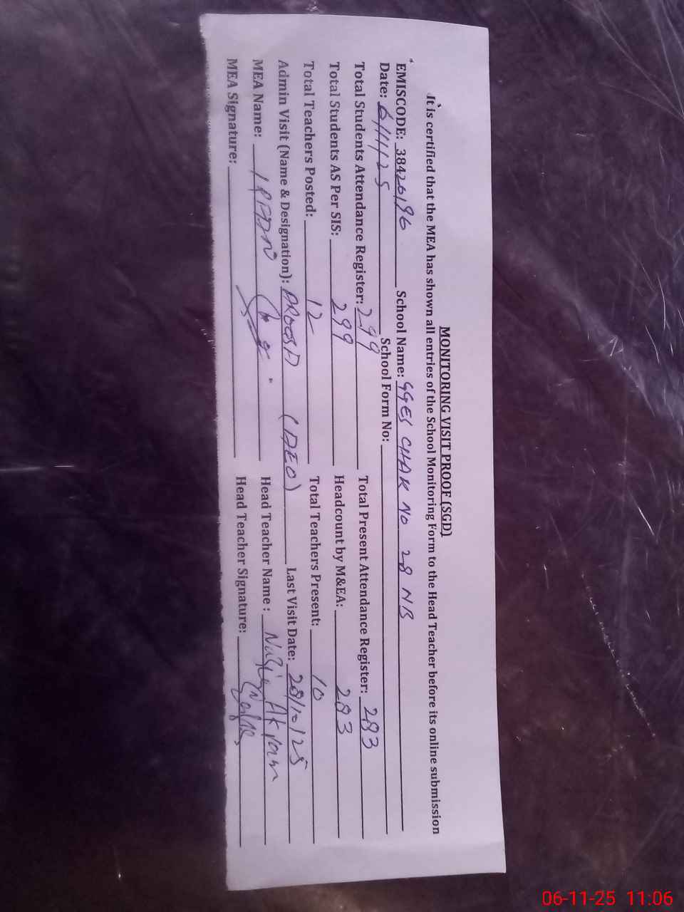 | Attendance Register | Head Teacher | MEA with School | Visit Proof |