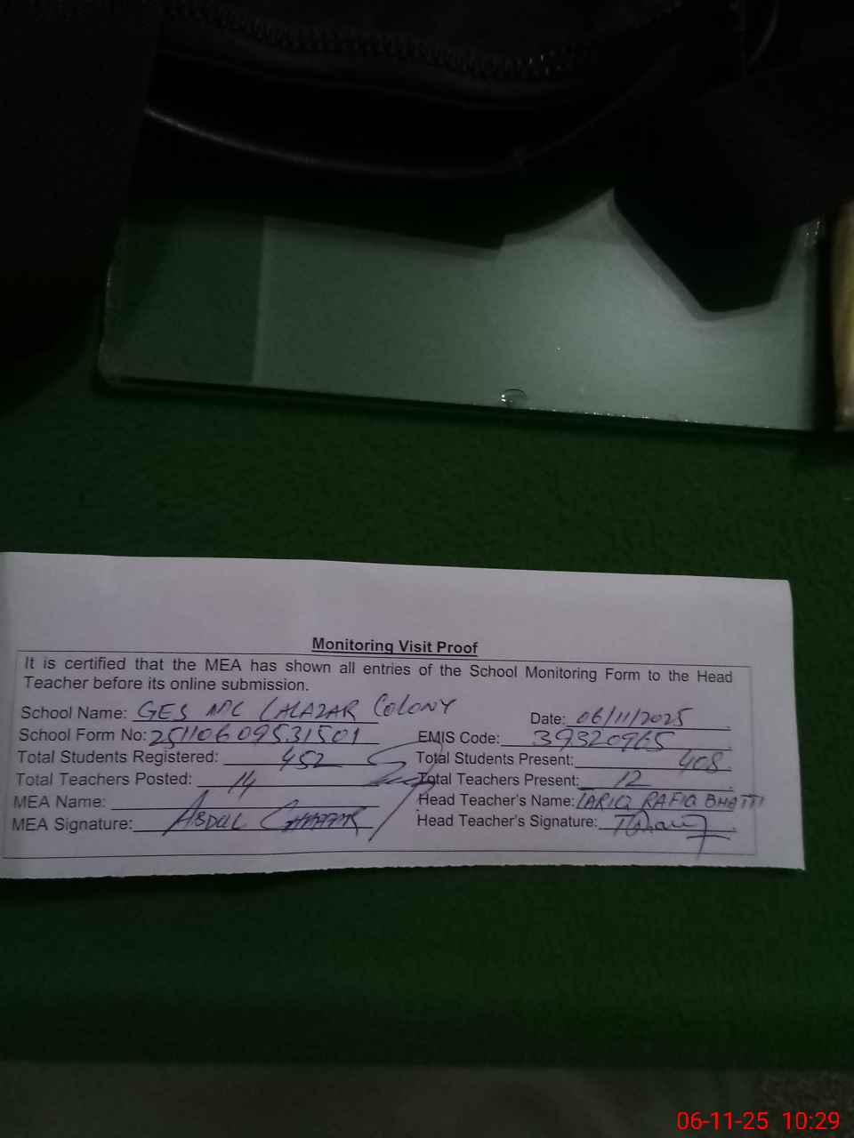 | Attendance Register | Head Teacher | MEA with School | Visit Proof |