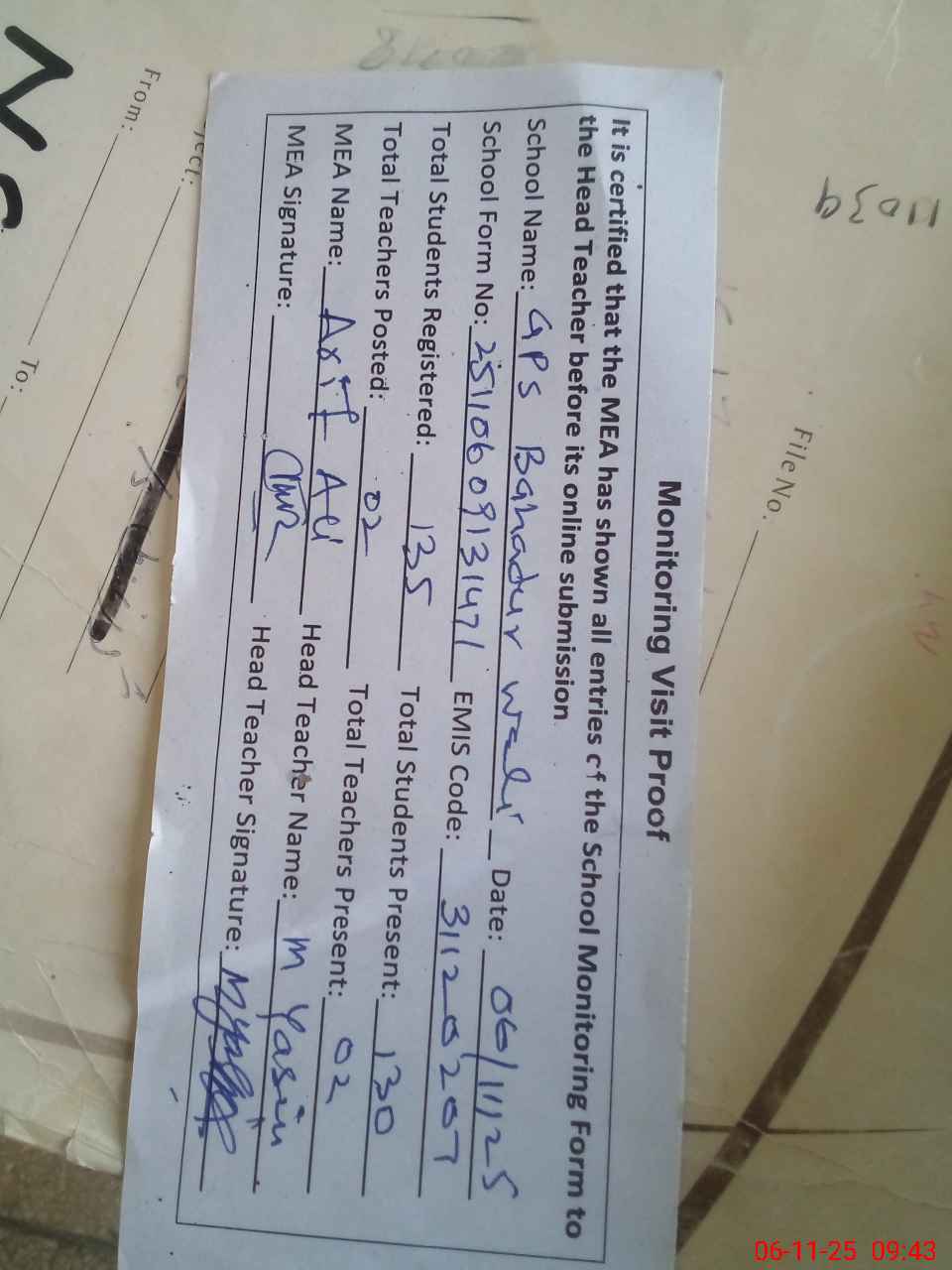 | EMIS Code: 31120207 | Name of School: GPS BAHADAR WALI | |||