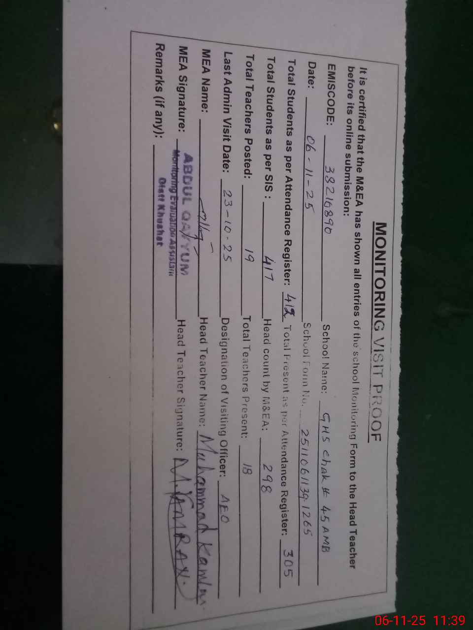 | EMIS Code: 38210890 | Name of School: GHS CHAK NO. 45 AMB | |||