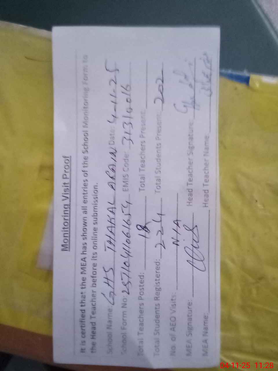 | EMIS Code: 31310016 | Name of School: GHS THAKKAL ARAIN | |||