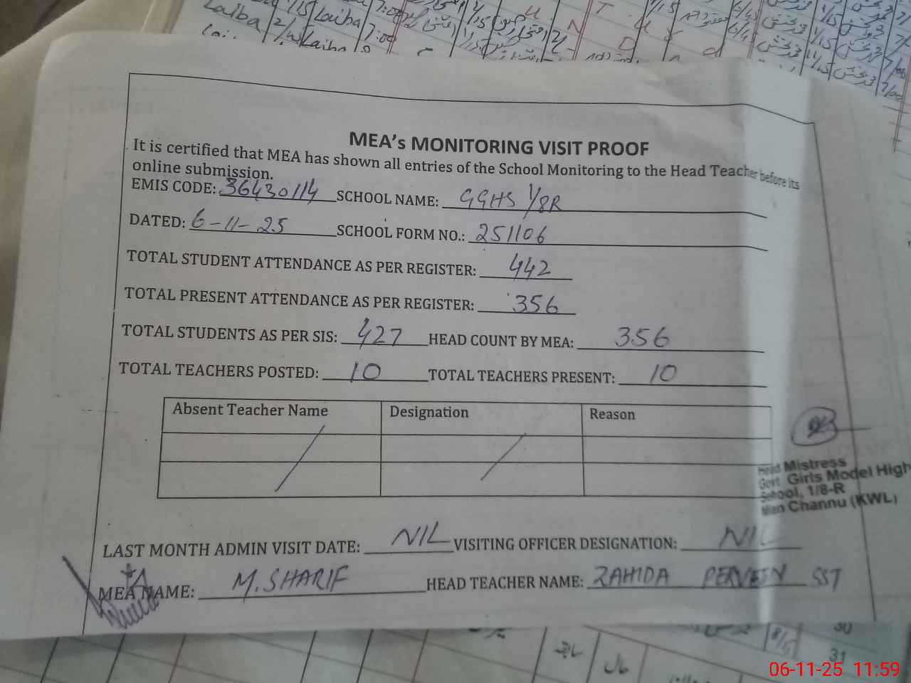 | Attendance Register | Head Teacher | MEA with School | Visit Proof |