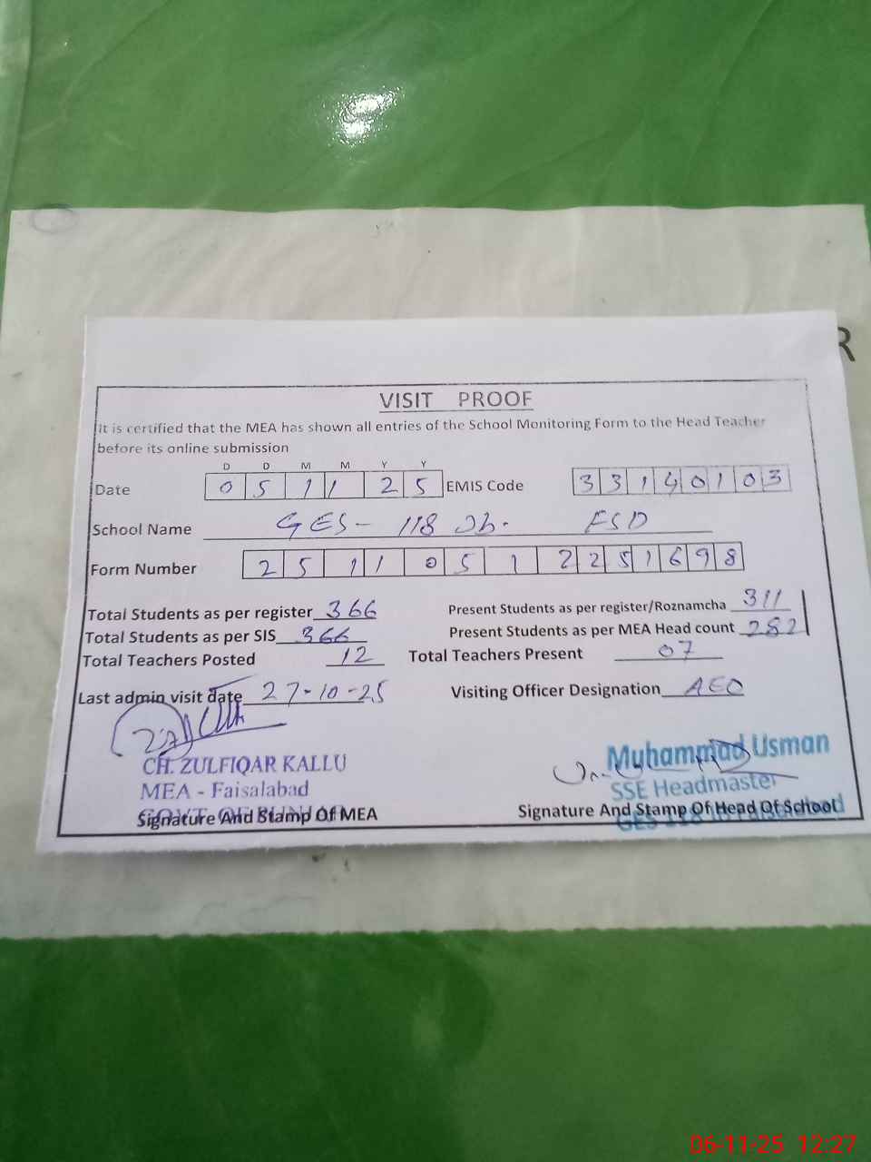 | Attendance Register | Head Teacher | MEA with School | Visit Proof |