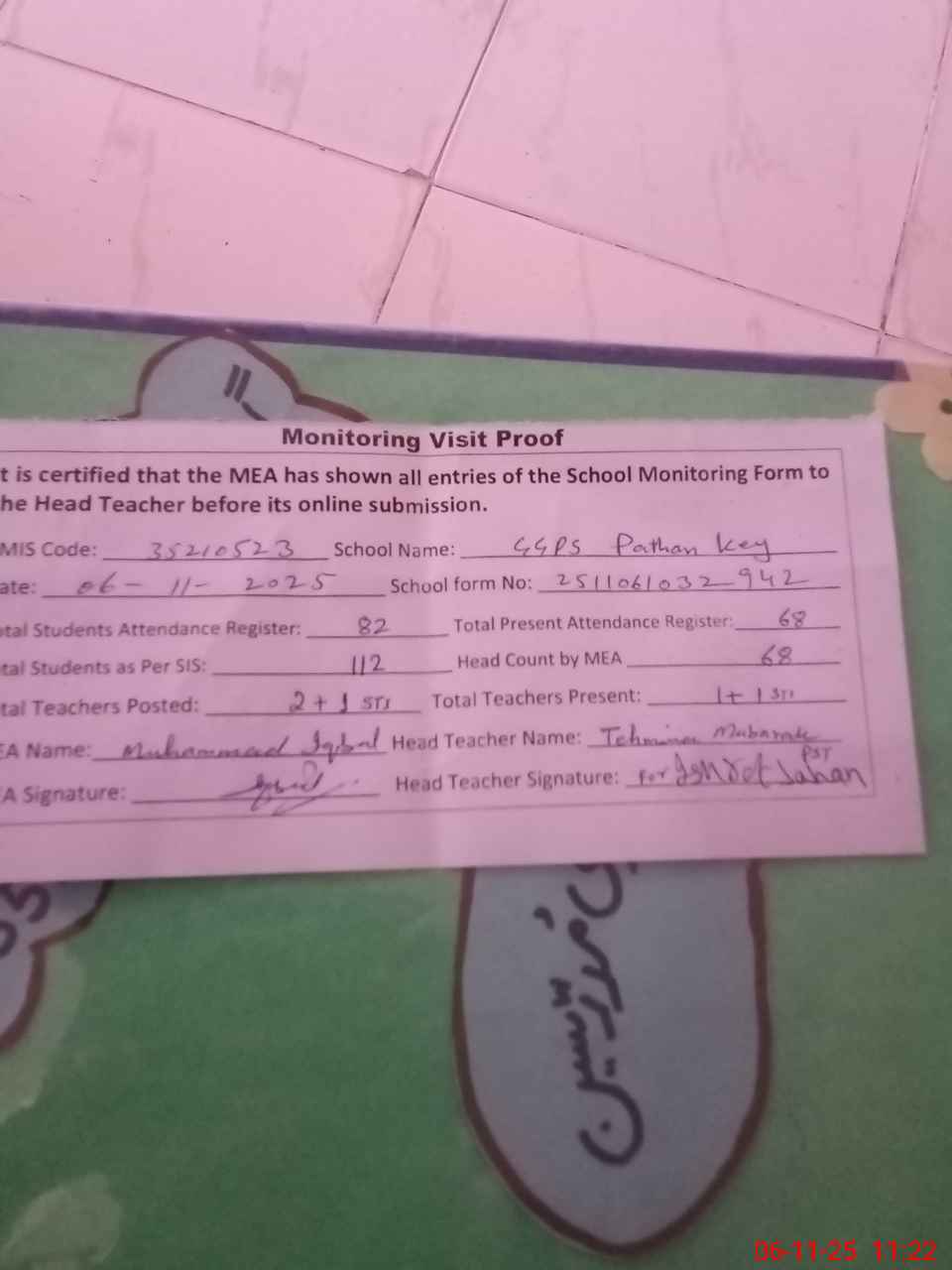 | Attendance Register | Head Teacher | MEA with School | Visit Proof |