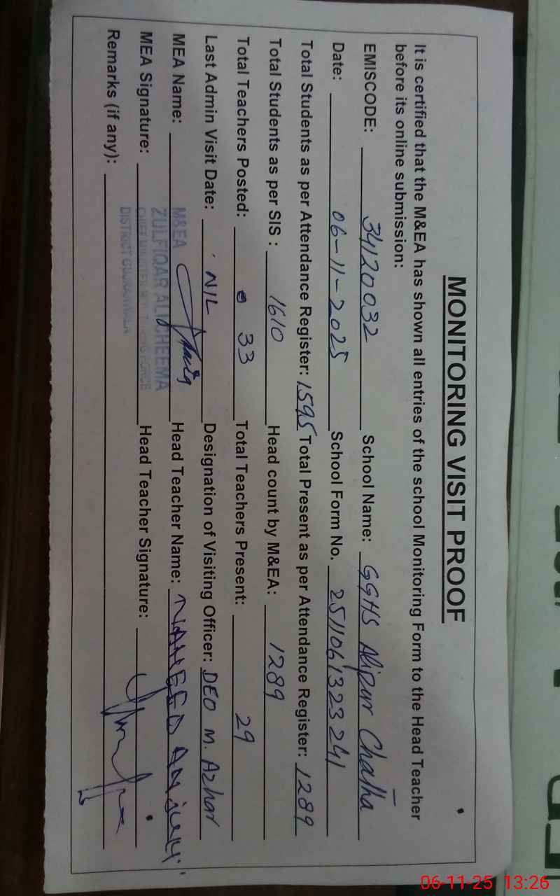 | EMIS Code: 34120032 | Name of School: GGHS ALI PUR CHATTHA | |||