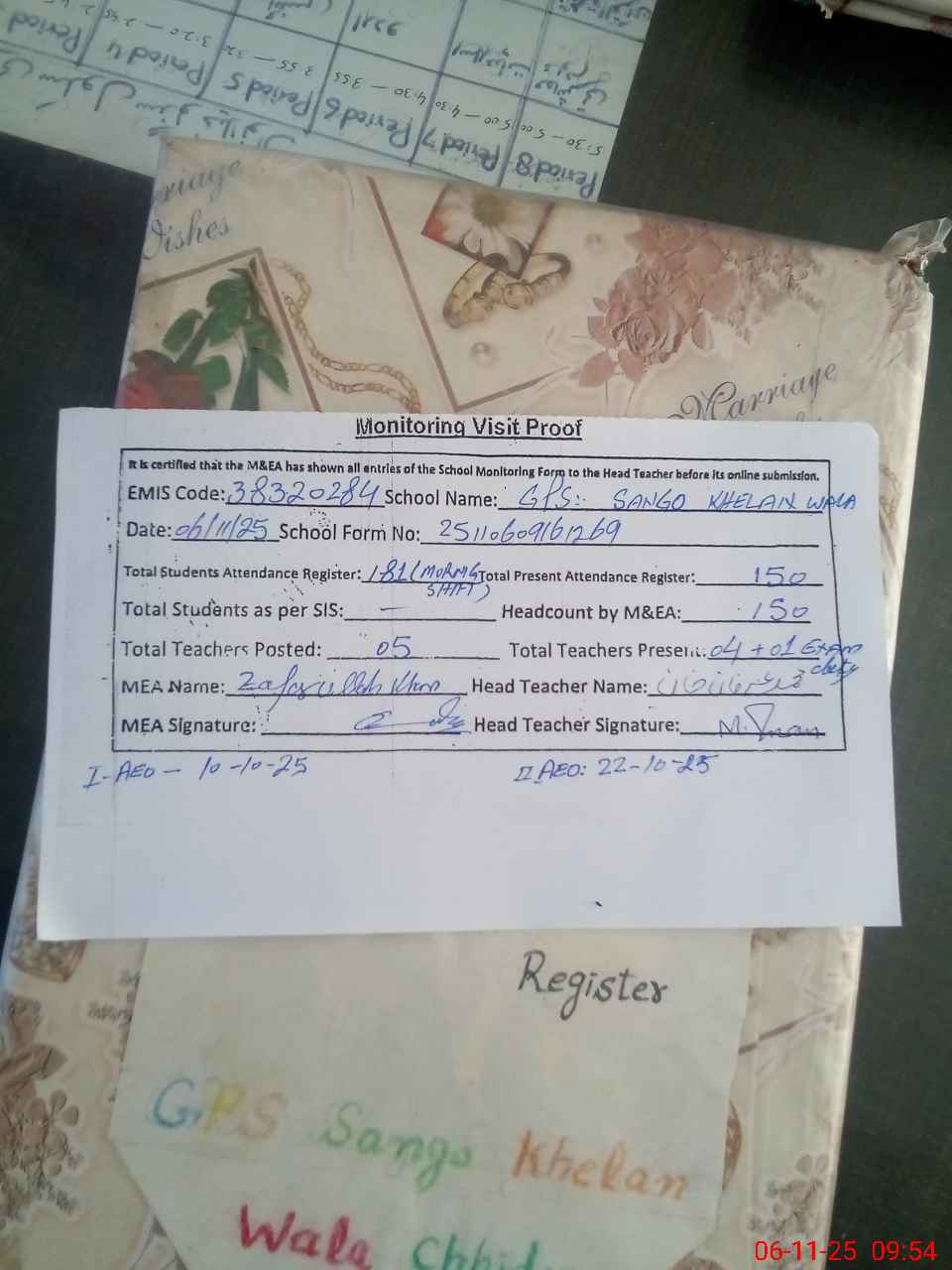 | Attendance Register | Head Teacher | MEA with School | Visit Proof |