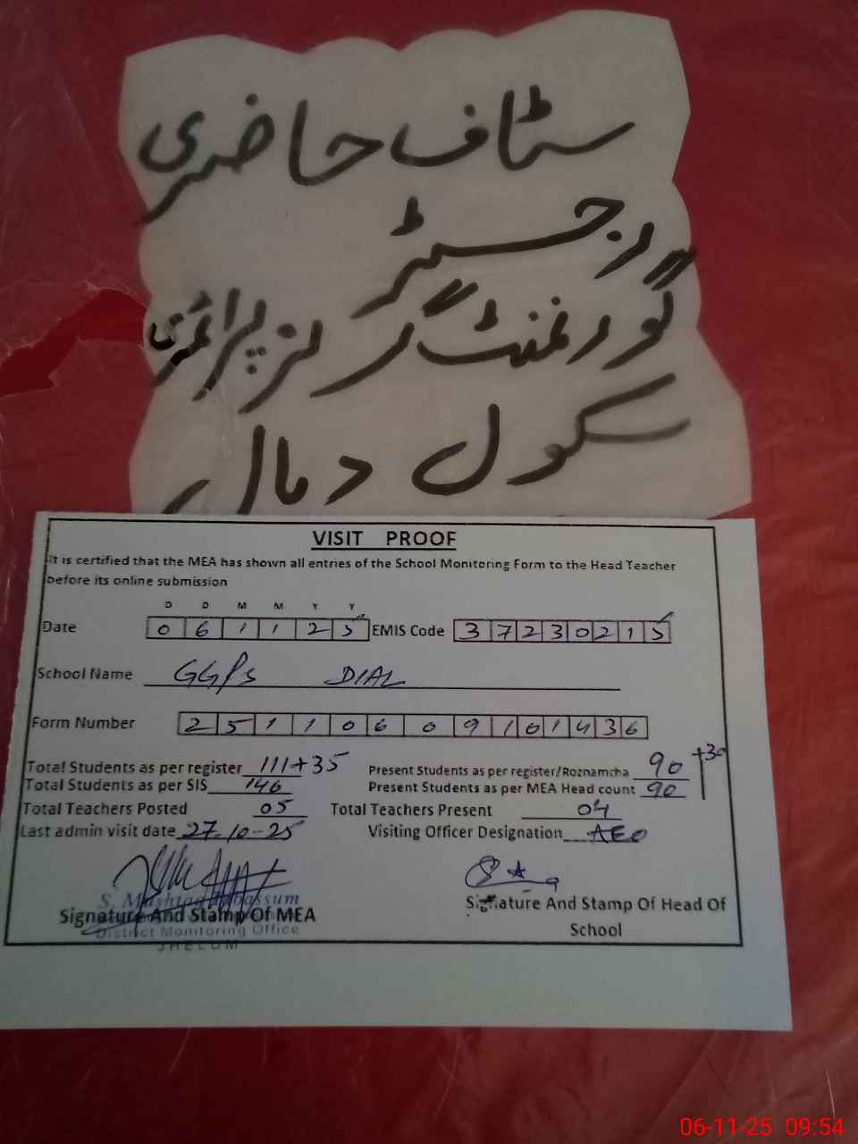 | Total no. of Classrooms: 4 No. of Classrooms Used for Teaching: 4 No. of Classrooms Storing Old Furniture, FTBs, etc: 0Comments if Any: HT Sehrish Khatoon PST is absent unauthorized NSB and FTF updated record not available |