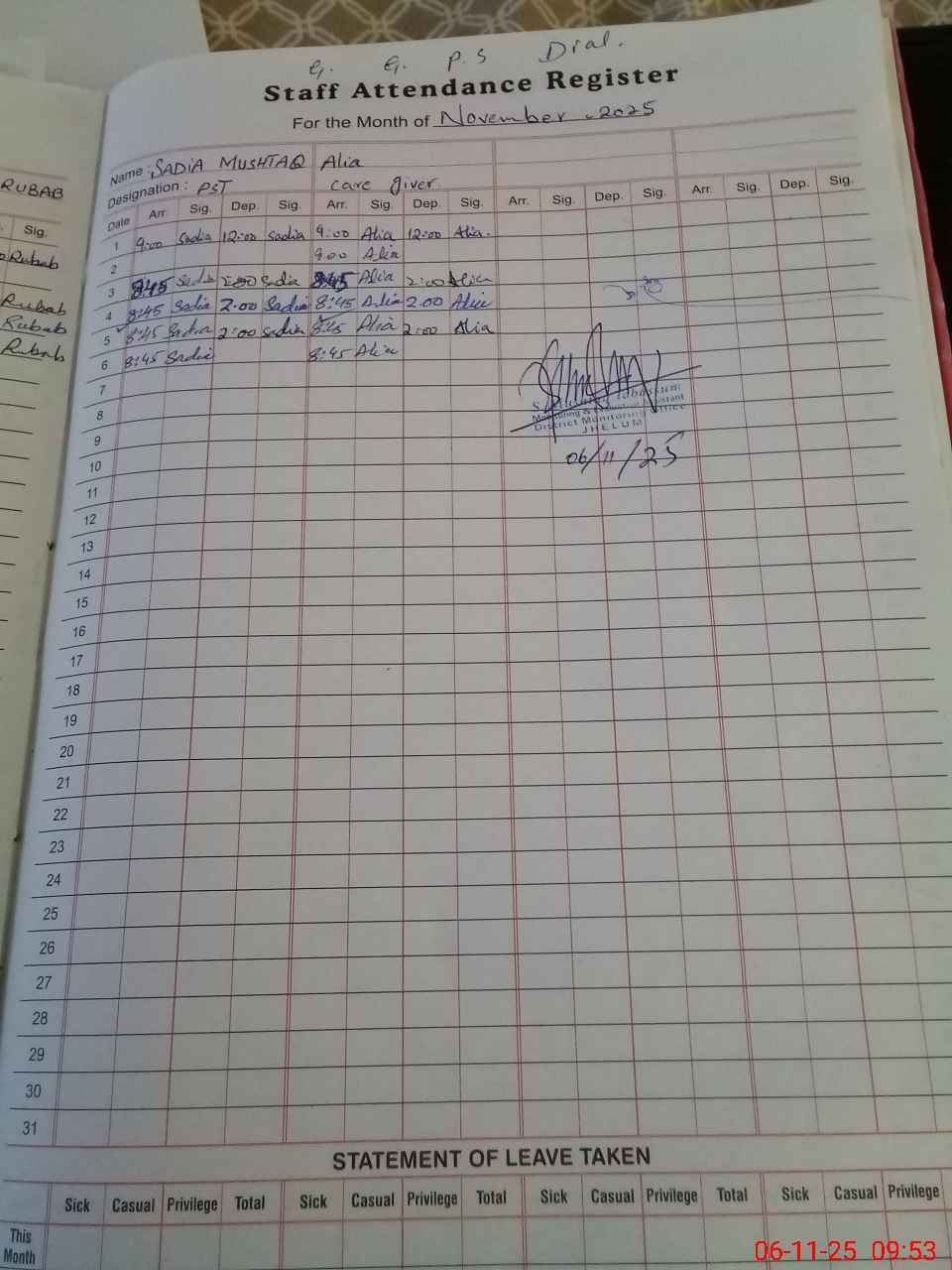 | Remarks (Use Separate Page if Required): HT Sehrish Khatoon PST is absent unauthorized NSB and FTF updated record not available | |||||