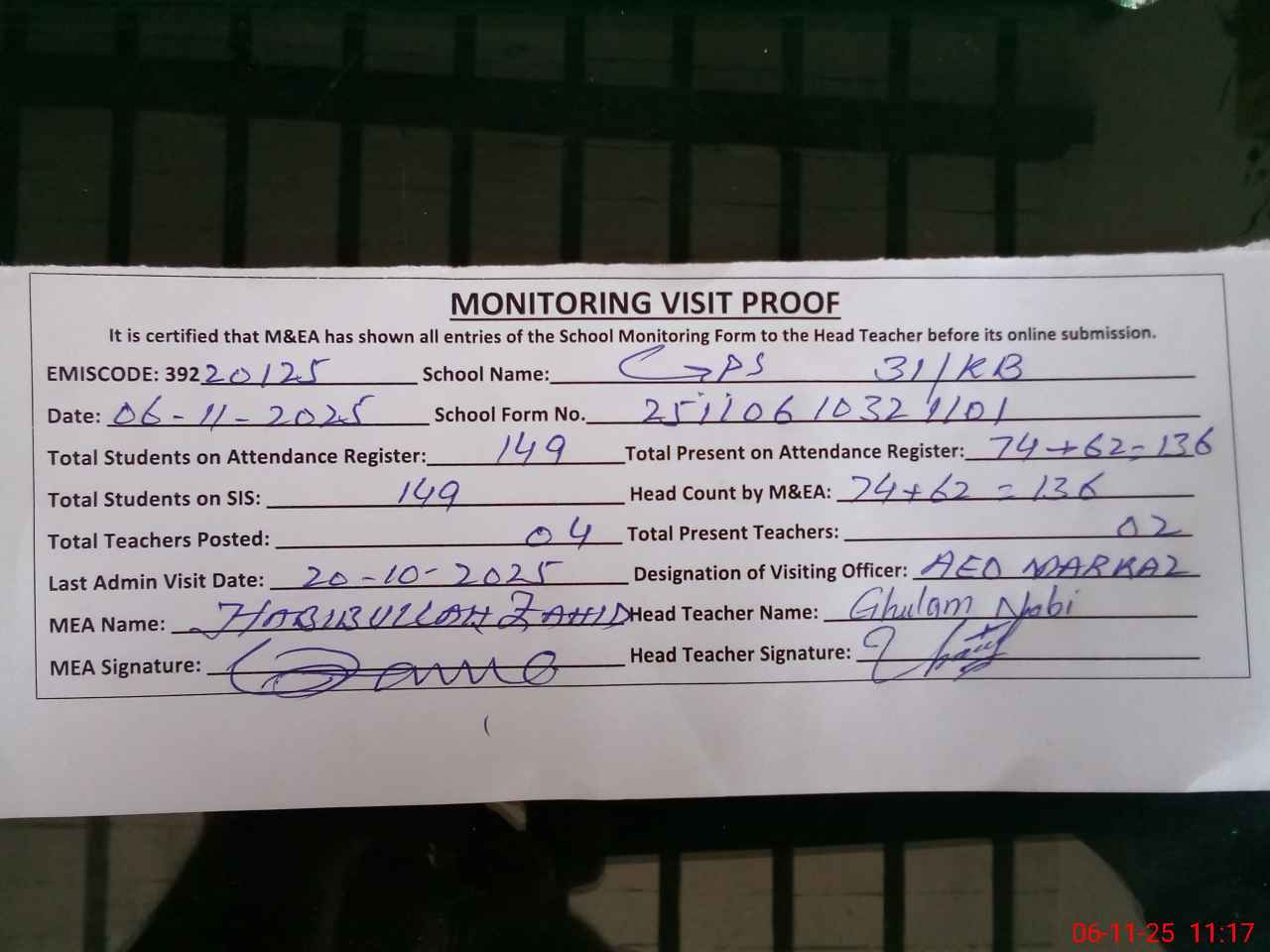 | Attendance Register | Head Teacher | MEA with School | Visit Proof |