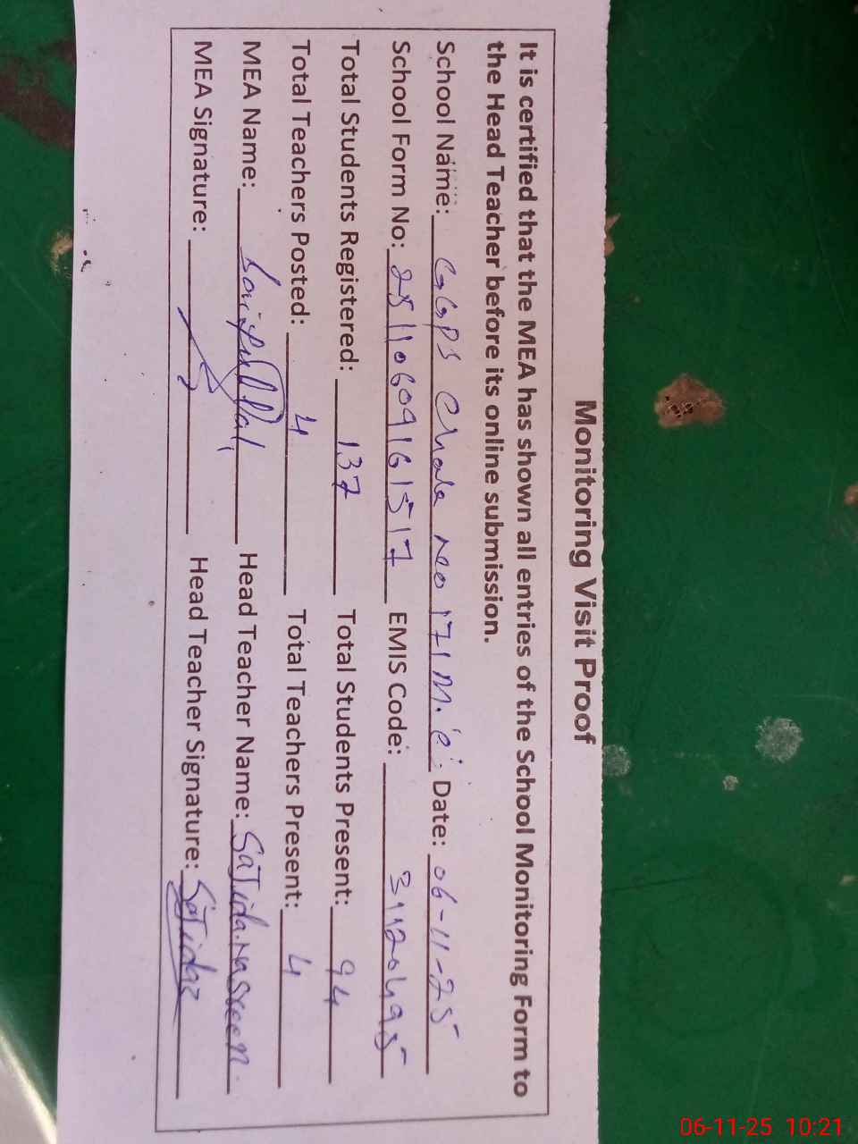 | Attendance Register | Head Teacher | MEA with School | Visit Proof |
