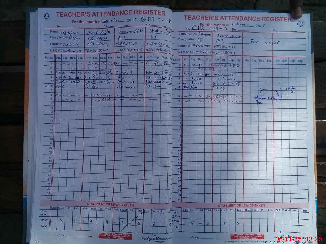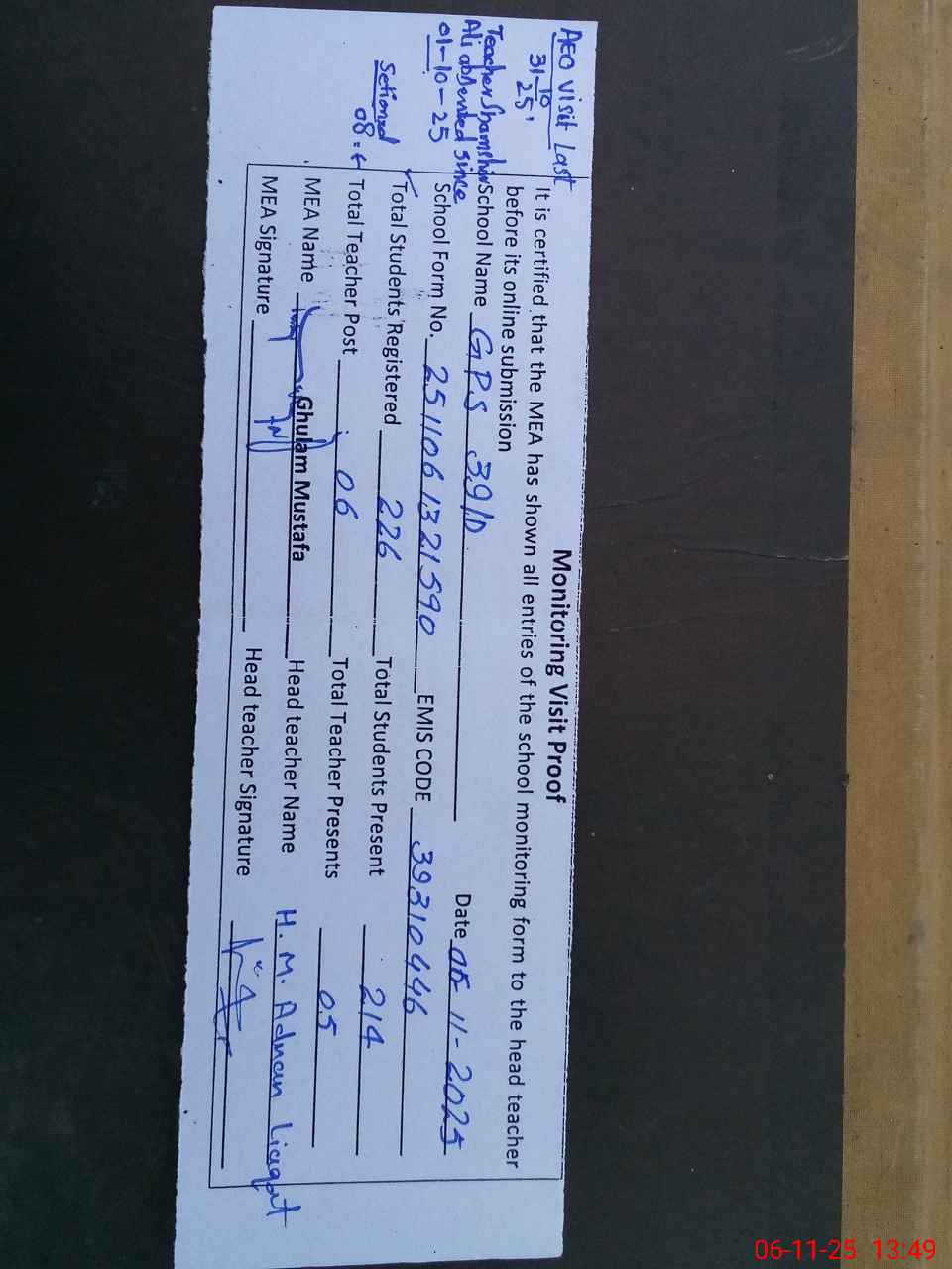 | Remarks (Use Separate Page if Required): Last visit by AEO is on 31 October 2025 Teacher Shamsher Ali PST absented himself from duty since 01 October 2025 Maximum boundary wall found nonfunctional Students enrollment as per SIS are 211 Entered students are 226 | |||||