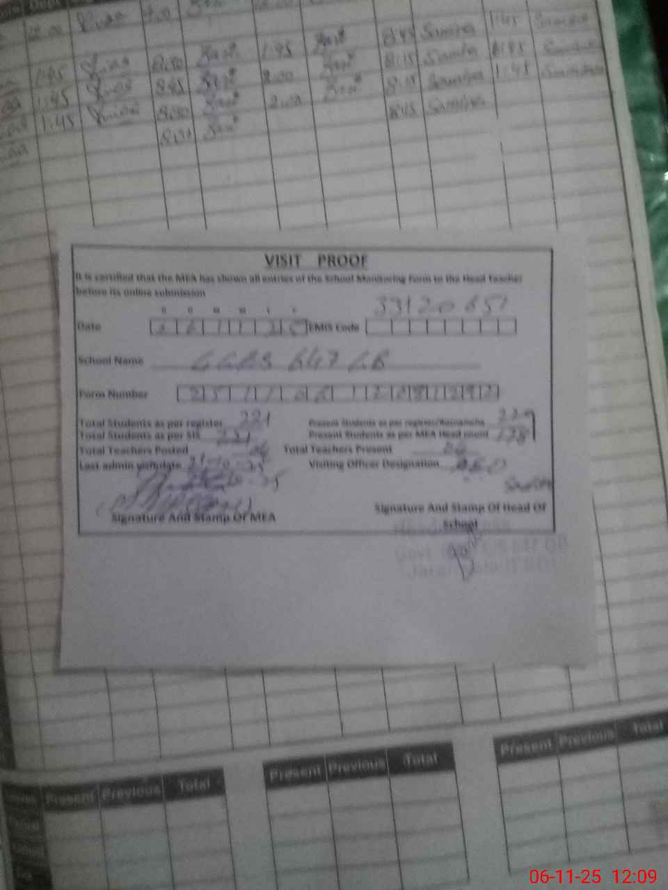 | Attendance Register | Head Teacher | MEA with School | Visit Proof |