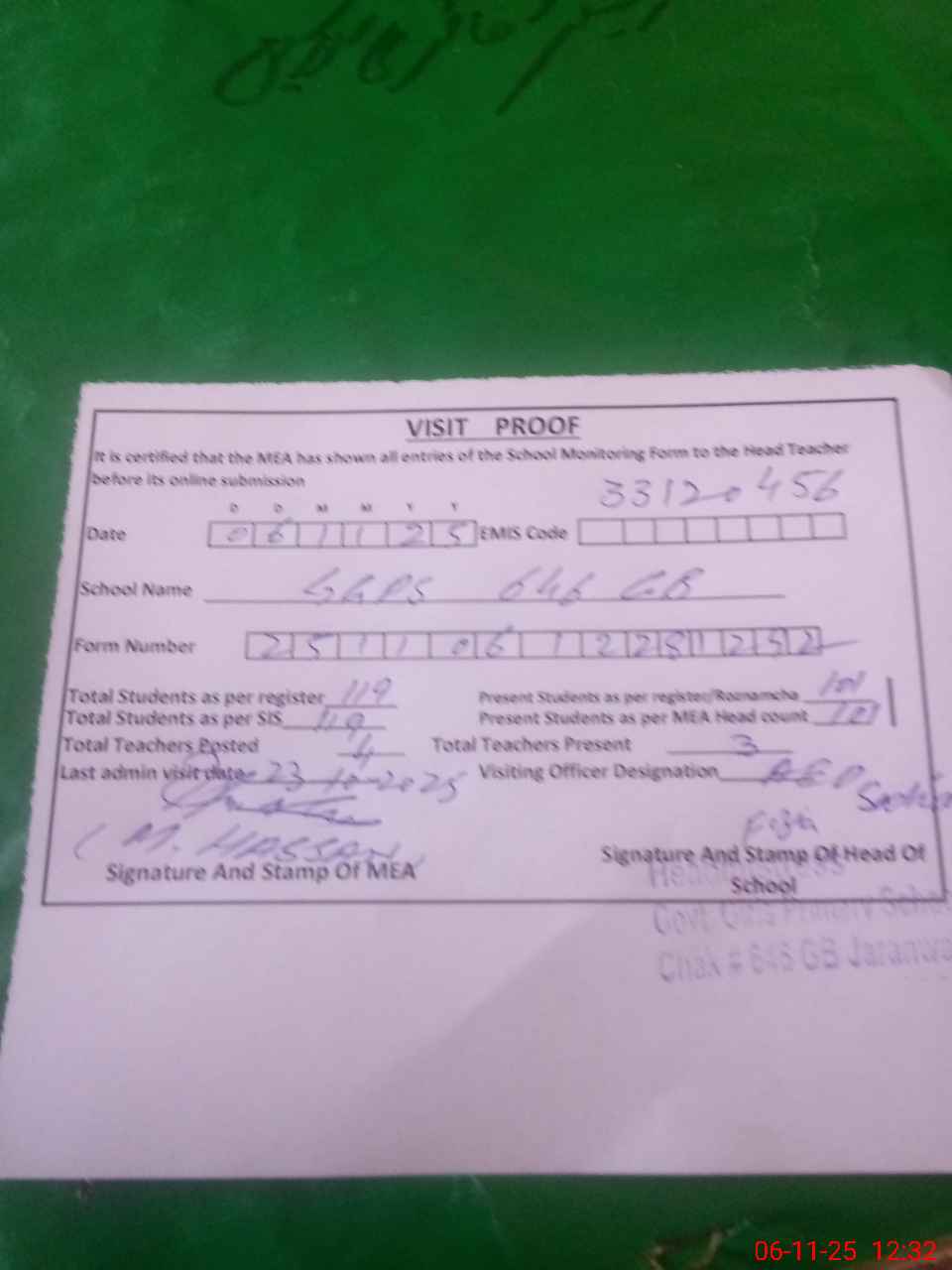 | Attendance Register | Head Teacher | MEA with School | Visit Proof |