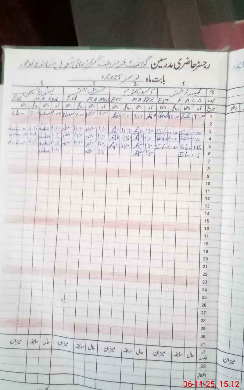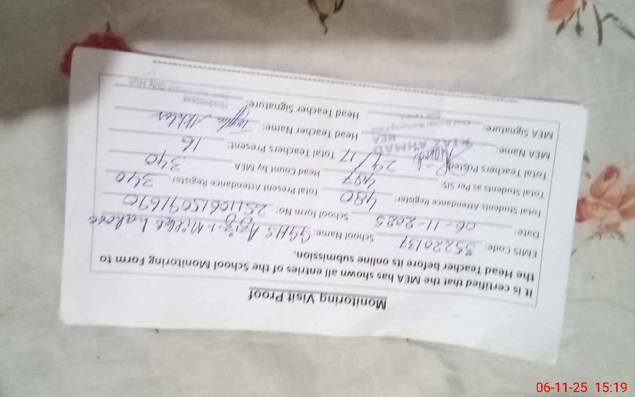 | Remarks (Use Separate Page if Required): This school is using the building of GGHS Sanda kalan in the evening School opening time 1330 and closing 1630 According to the head teacher low attendance of students is due to vaccination compaign | |||||