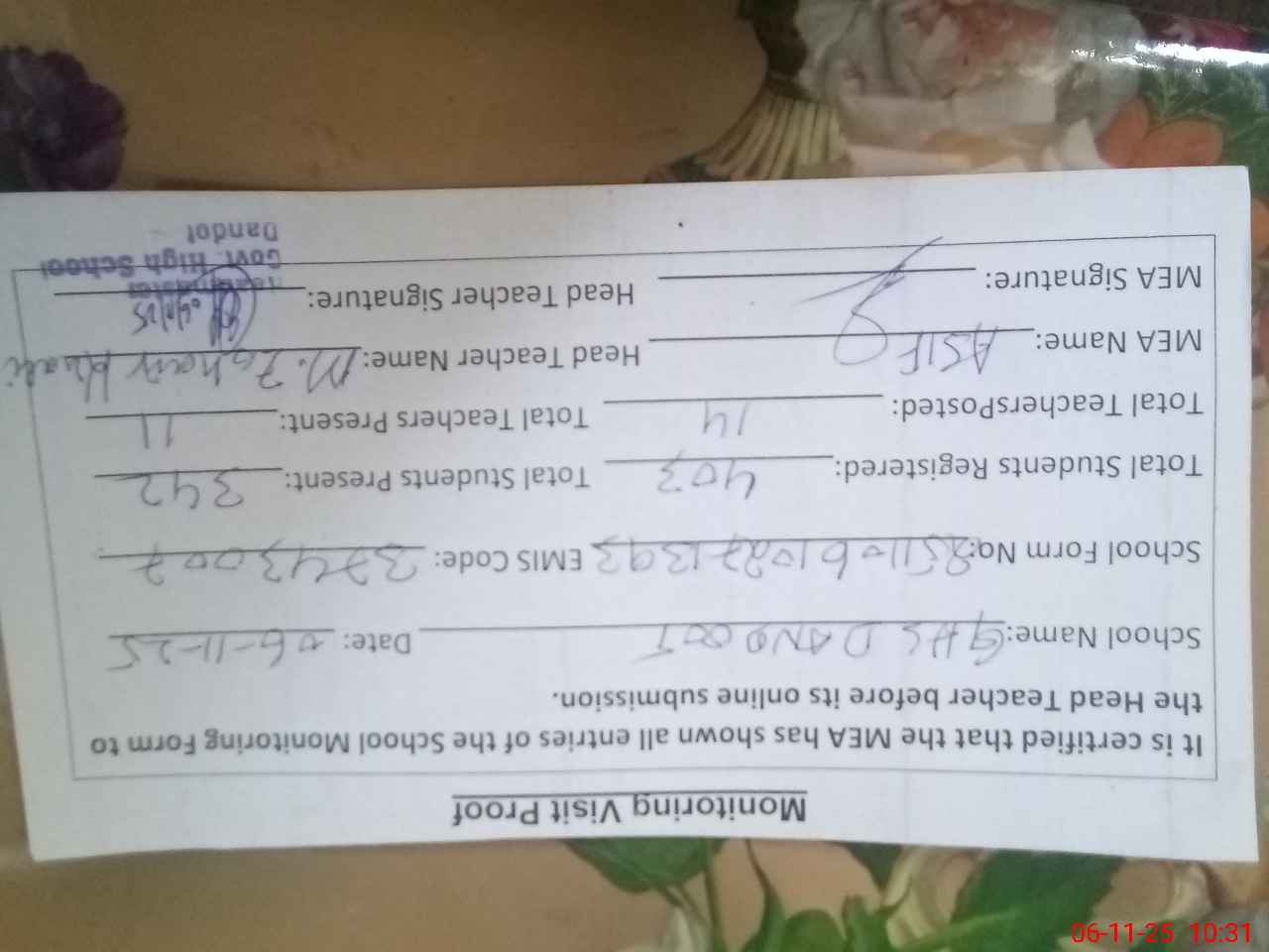 | Certified that this School was Inspected by the Undersigned MEA/DMO Today and the Information Stated Above is as Per Record. | |||||