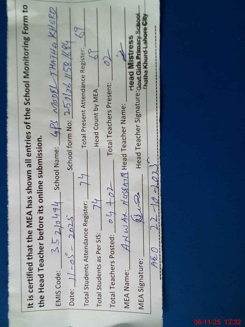 | Attendance Register | Head Teacher | MEA with School | Visit Proof |