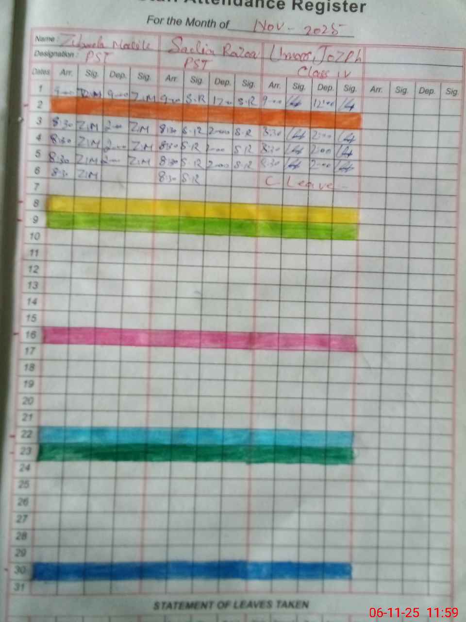 | 35**** | Um**** Jo**** | CLASS IV | 0 | 0 | 2 | 0 | 0 | 0 | 0 | 0 | 0 | Absent (Un-Authorized) | |