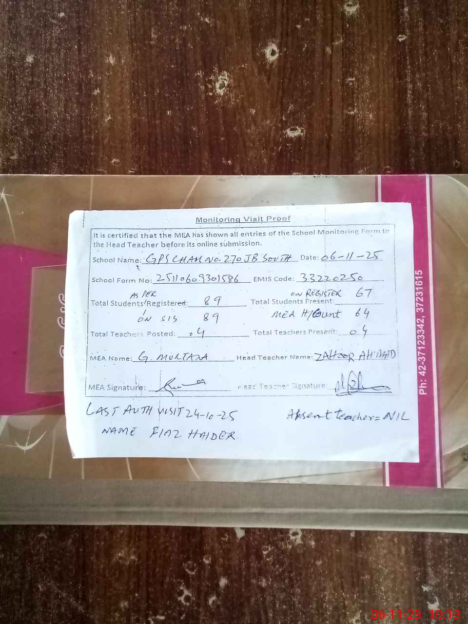 | EMIS Code: 33220250 | Name of School: GPS CHAK NO 270 JB SOUTH | |||