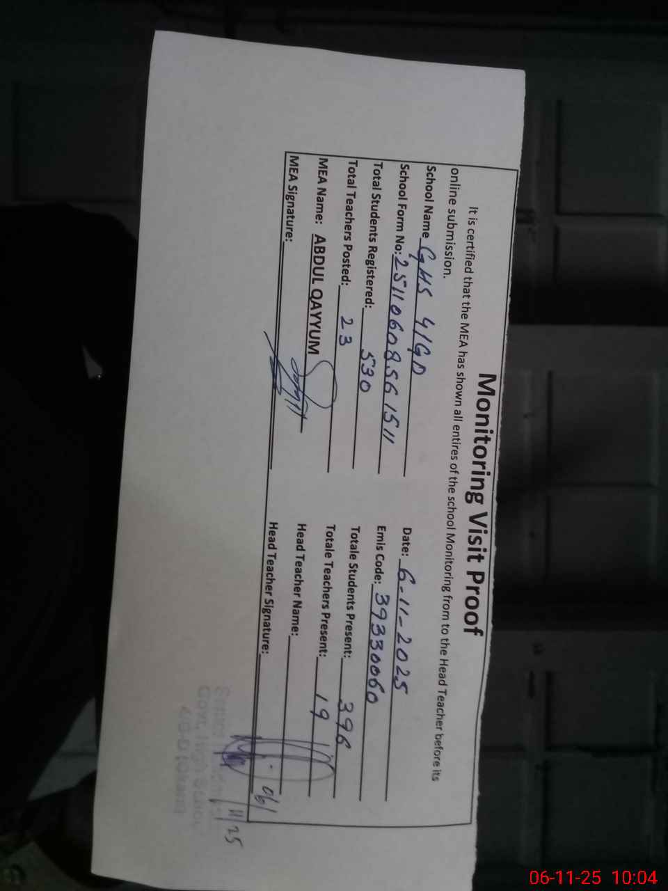| Attendance Register | Head Teacher | MEA with School | Visit Proof |