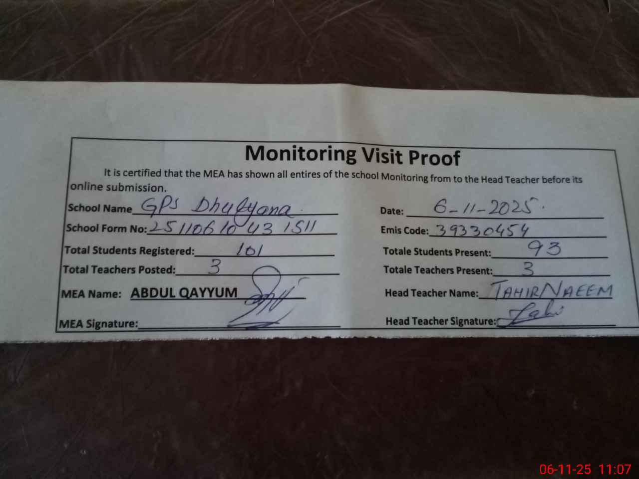 | EMIS Code: 39330454 | Name of School: GPS DHULYANA | |||