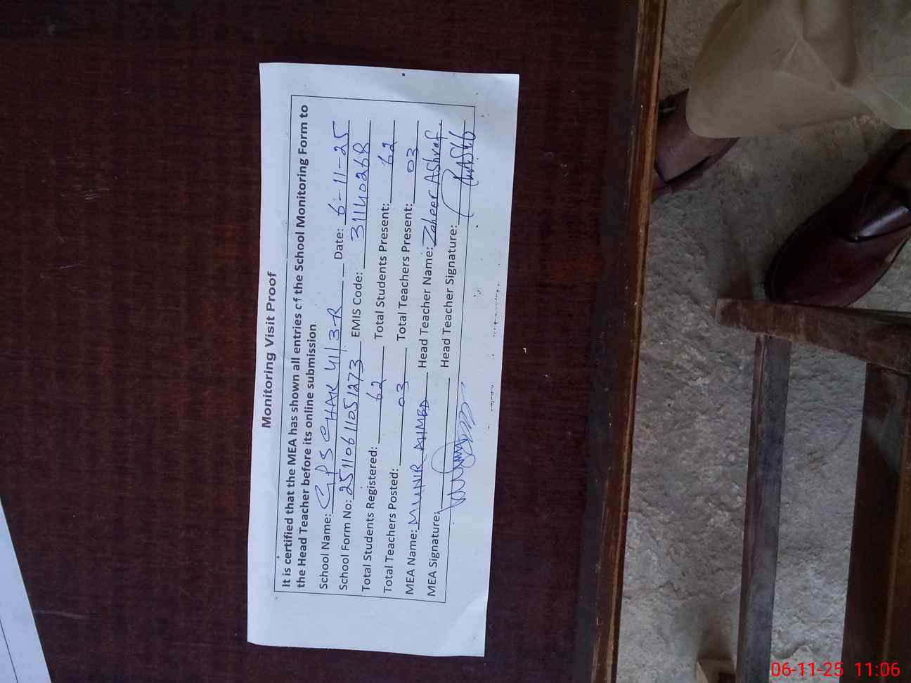 | Attendance Register | Head Teacher | MEA with School | Visit Proof |