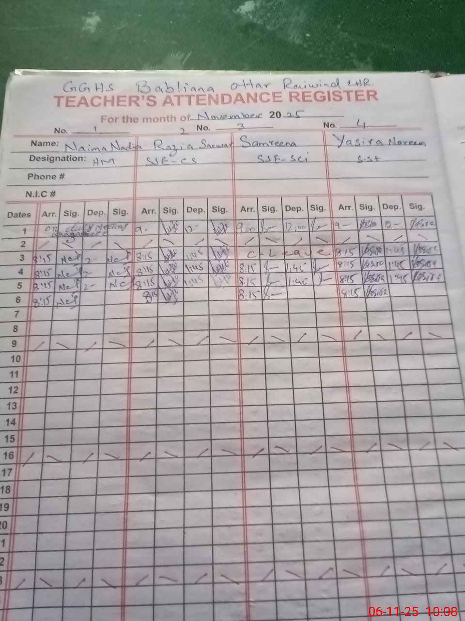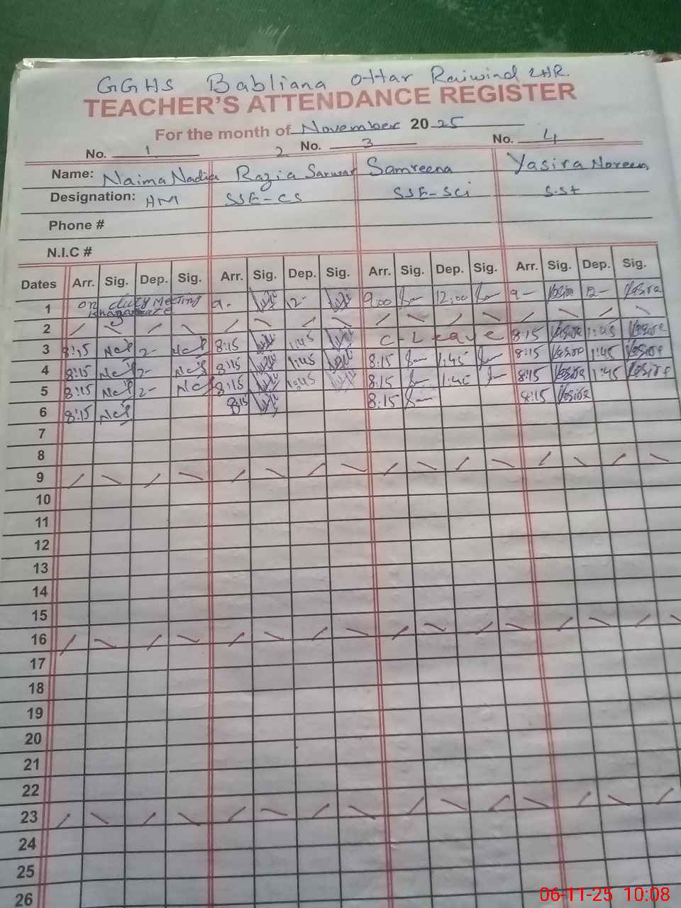 | CNIC | Full Name | Designation | R/C | Absence During Last Calender Month |