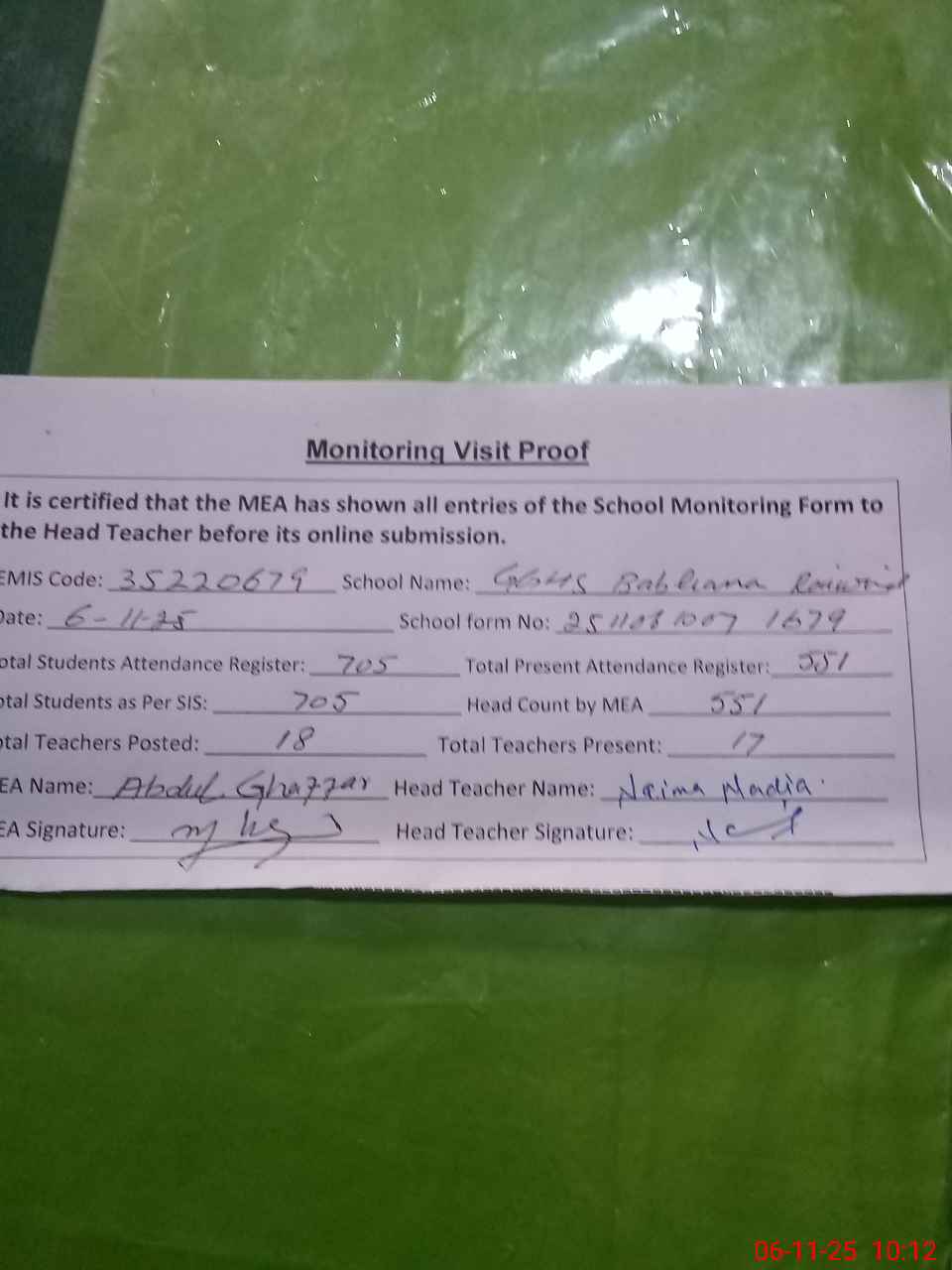 | Attendance Register | Head Teacher | MEA with School | Visit Proof |