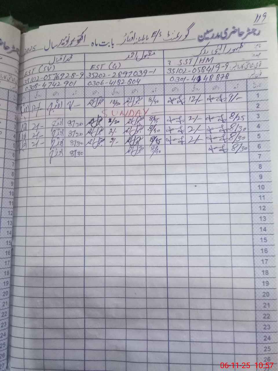 | CNIC | Full Name | Designation | R/C | Absence during last cal. month |