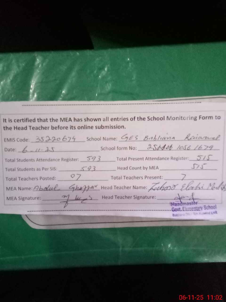 | Attendance Register | Head Teacher | MEA with School | Visit Proof |