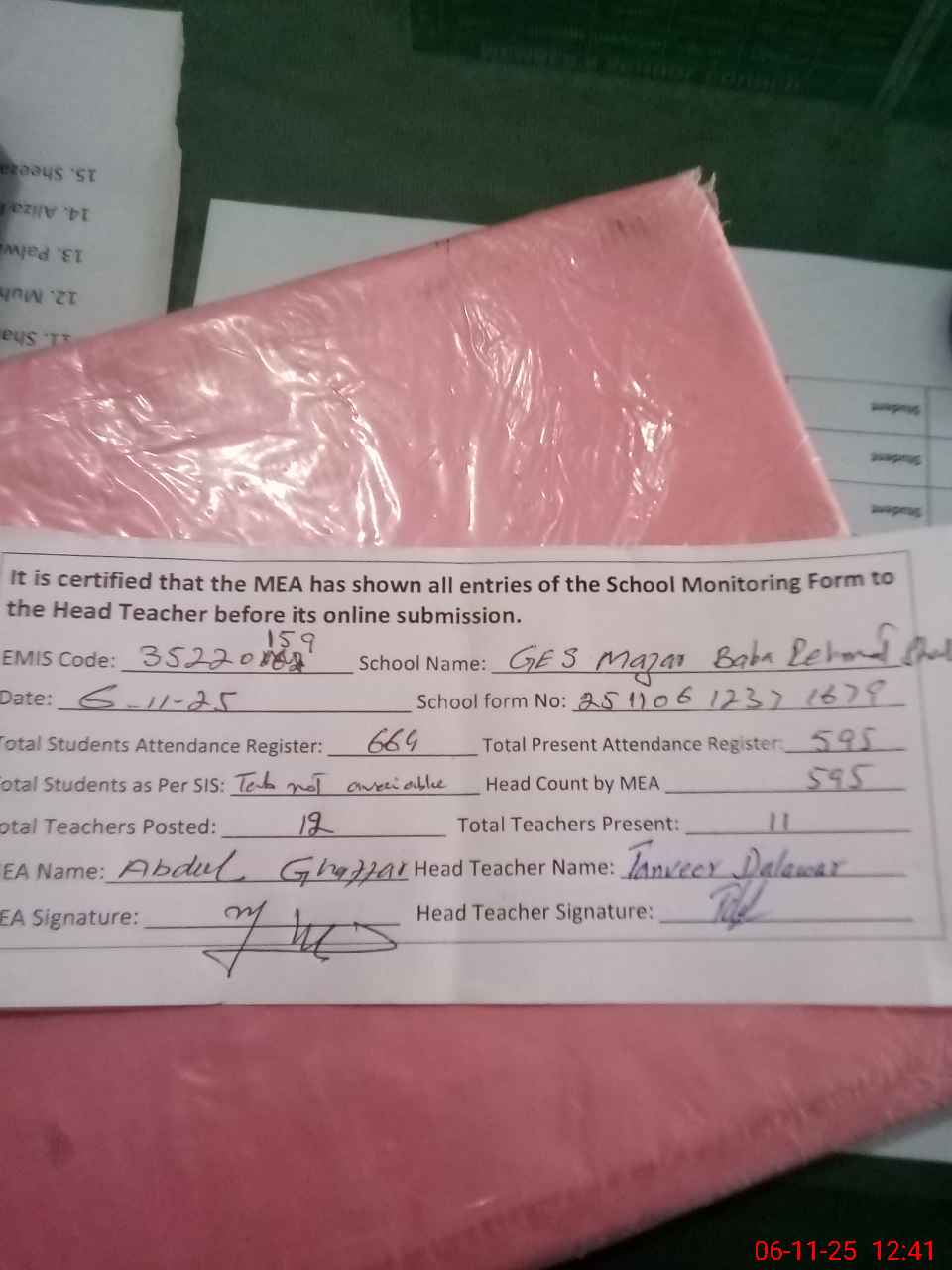 | Attendance Register | Head Teacher | MEA with School | Visit Proof |