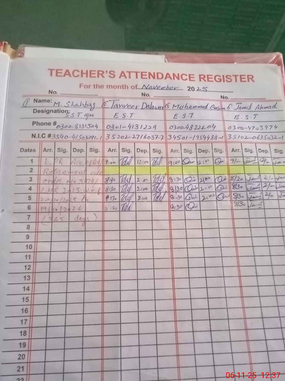 | CNIC | Full Name | Designation | R/C | Absence During Last Calender Month |