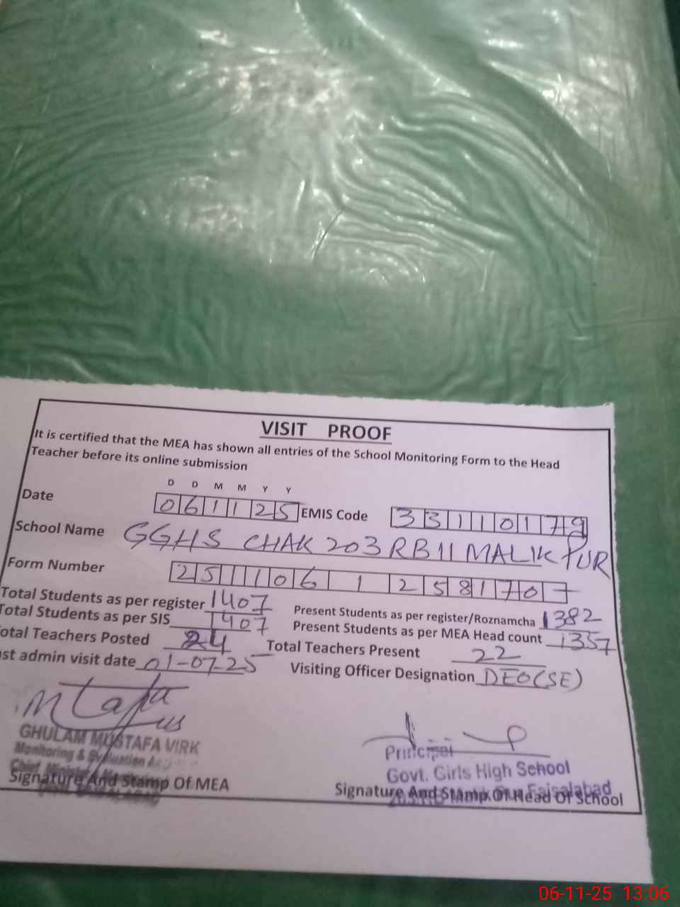 | Certified that this School was Inspected by the Undersigned MEA/DMO Today and the Information Stated Above is as Per Record. | |||||