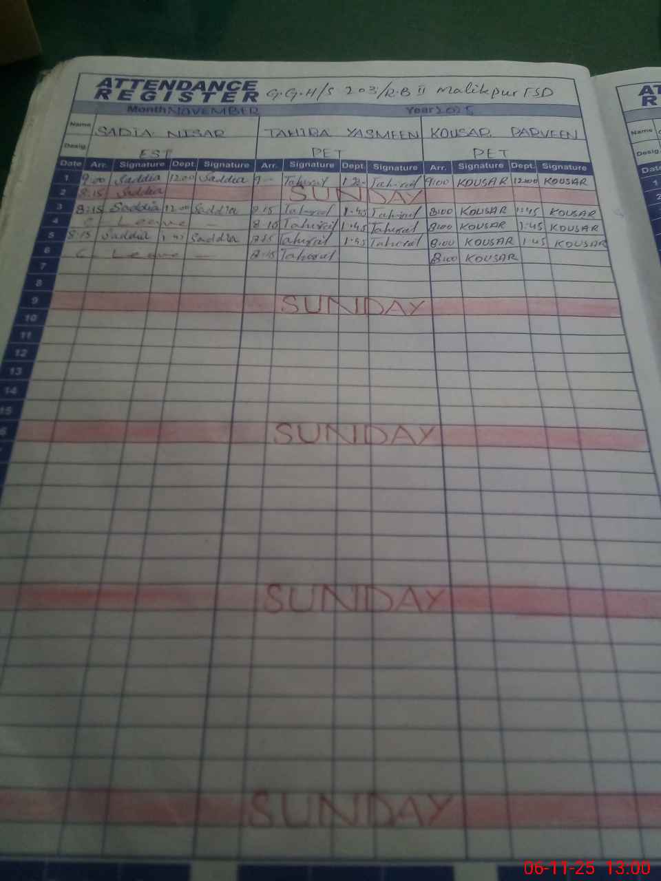 | CNIC | Full Name | Designation | R/C | Absence During Last Calender Month |