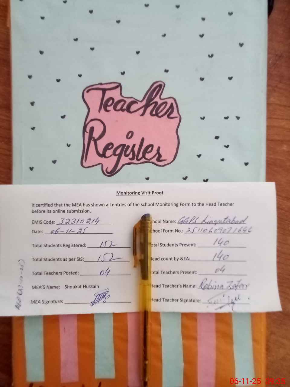 | Attendance Register | Head Teacher | MEA with School | Visit Proof |