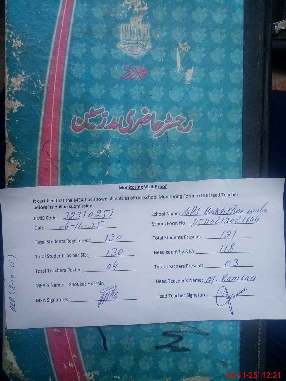 | Attendance Register | Head Teacher | MEA with School | Visit Proof |