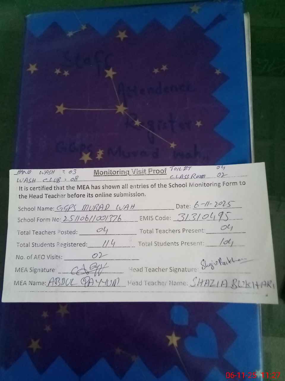 | Attendance Register | Head Teacher | MEA with School | Visit Proof |