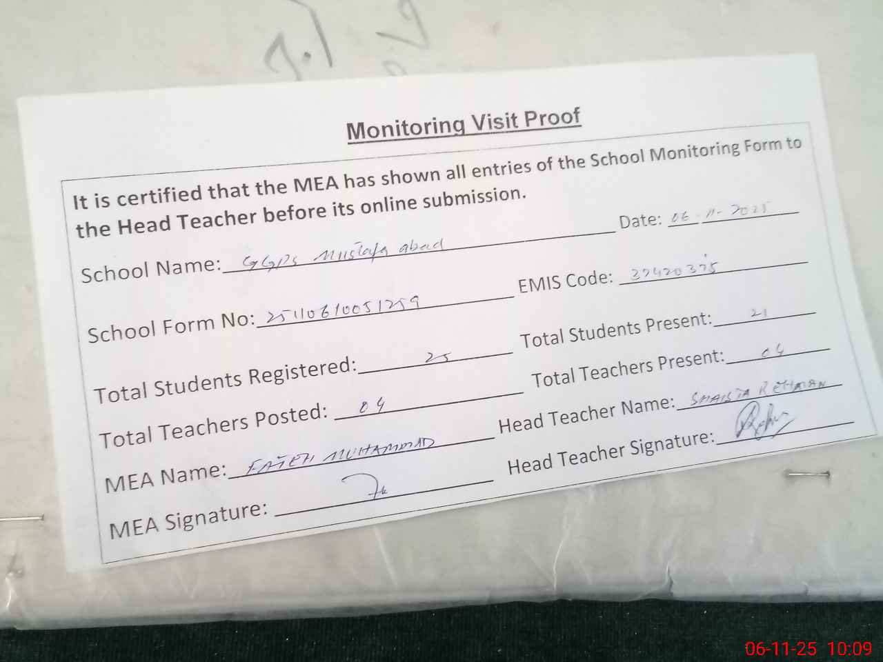| Attendance Register | Head Teacher | MEA with School | Visit Proof |