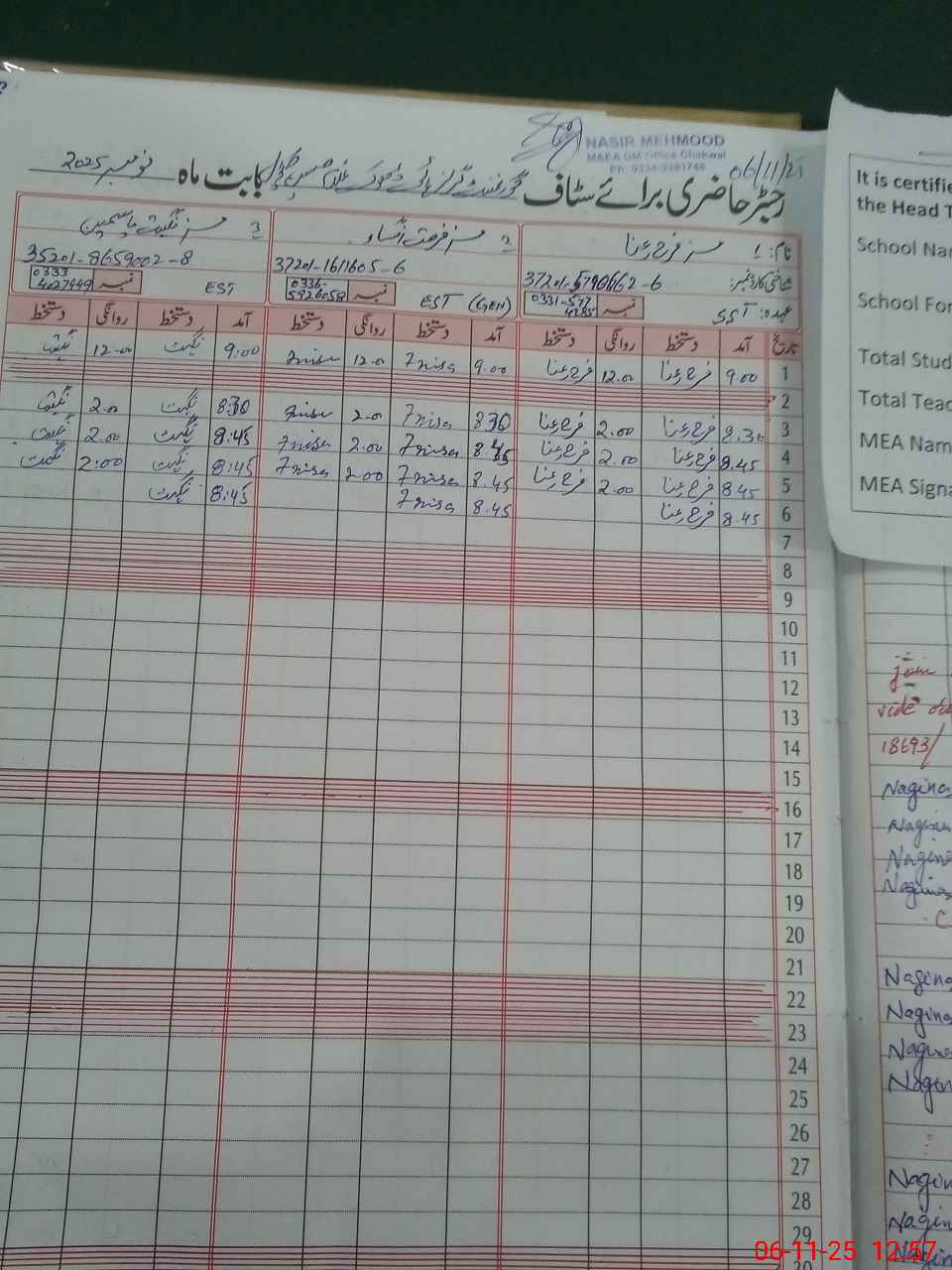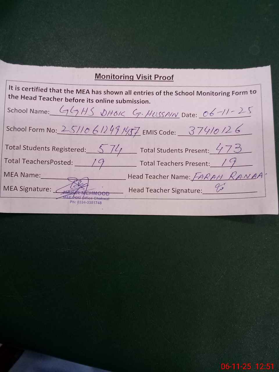 | Attendance Register | Head Teacher | MEA with School | Visit Proof |
