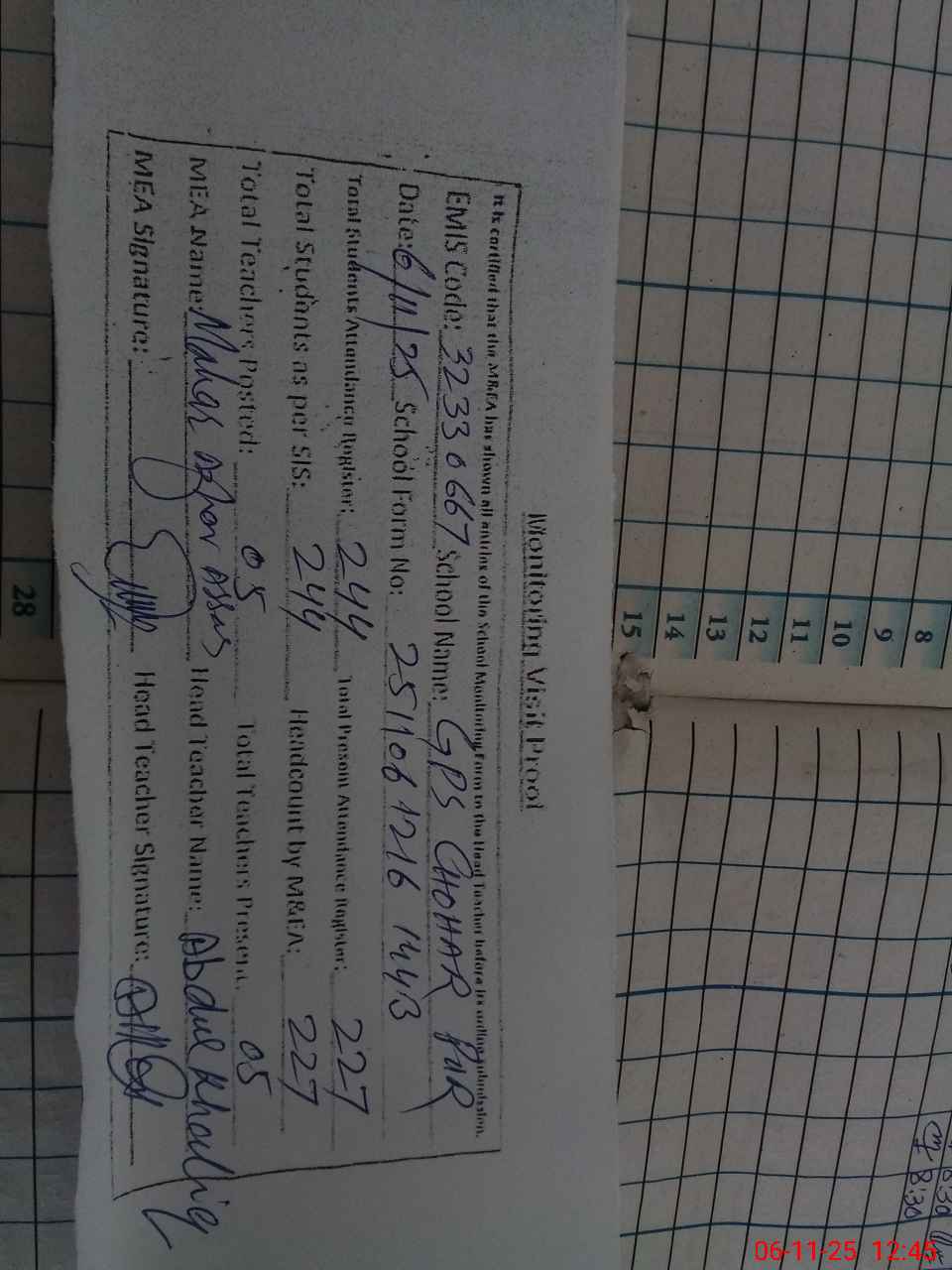 | Attendance Register | Head Teacher | MEA with School | Visit Proof |