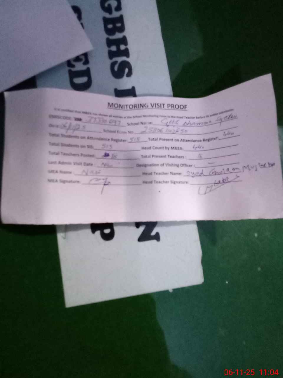 | Attendance Register | Head Teacher | MEA with School | Visit Proof |