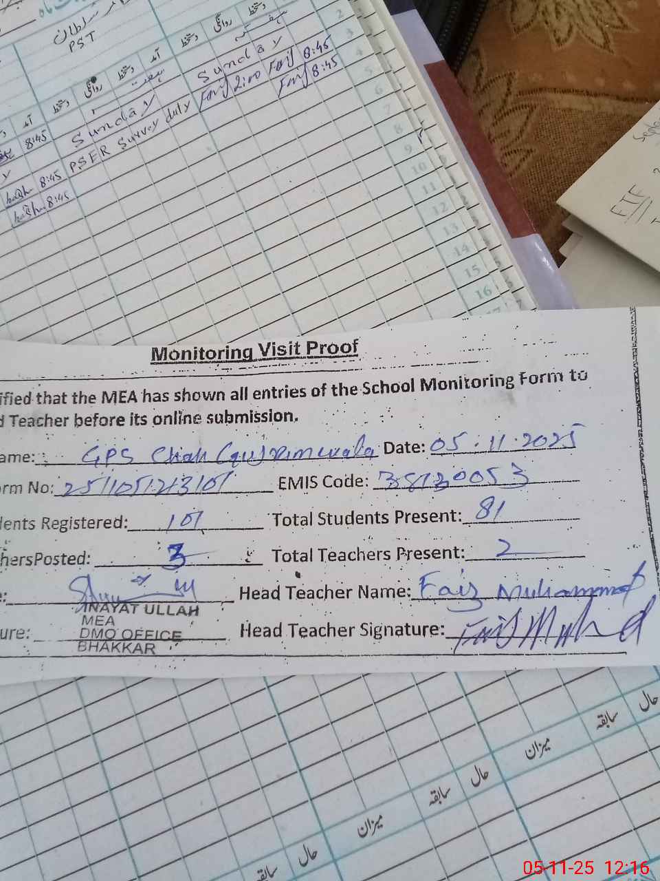 | Attendance Register | Head Teacher | MEA with School | Visit Proof |