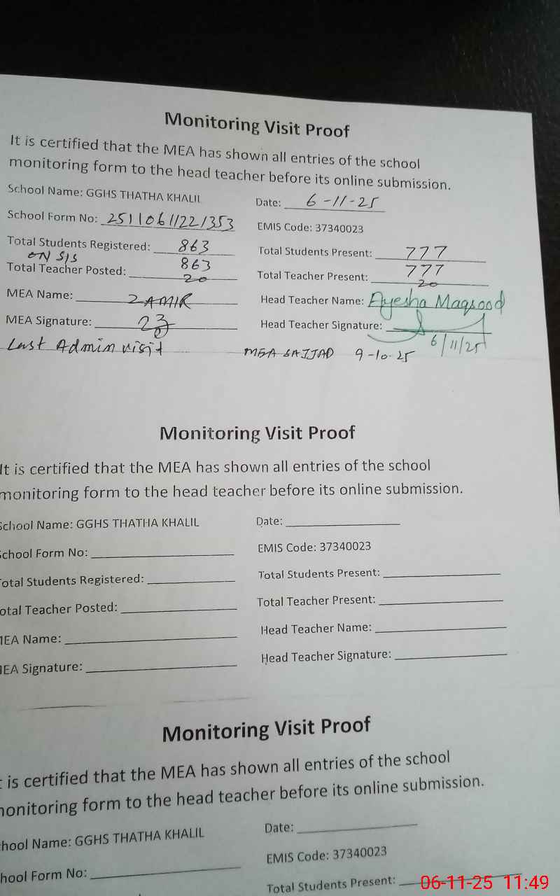 | Monitoring Date: 06-11-2025 | Start Time: 06-11-2025 11:08 AM | End Time: 06-11-2025 11:50 AM | Name of MEA: Za**** Ah**** | |