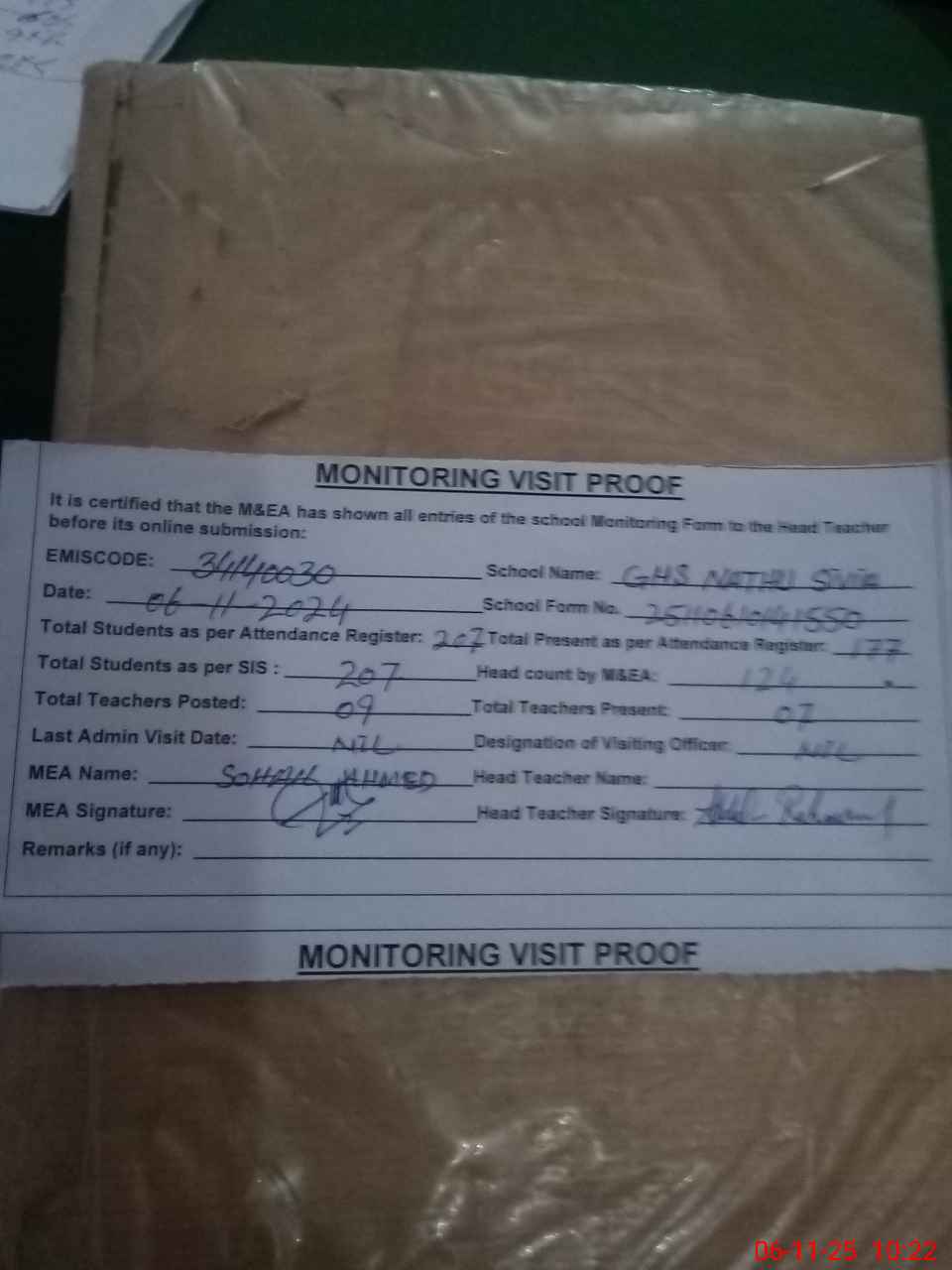 | Attendance Register | Head Teacher | MEA with School | Visit Proof |